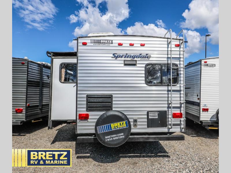 The rear kitchen layout is what makes this Keystone Springdale 293RK unique. This travel trailer also features a large living area slide for added space, two lounge chairs, plus so much more!