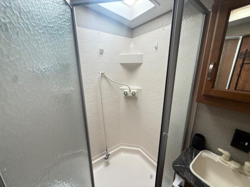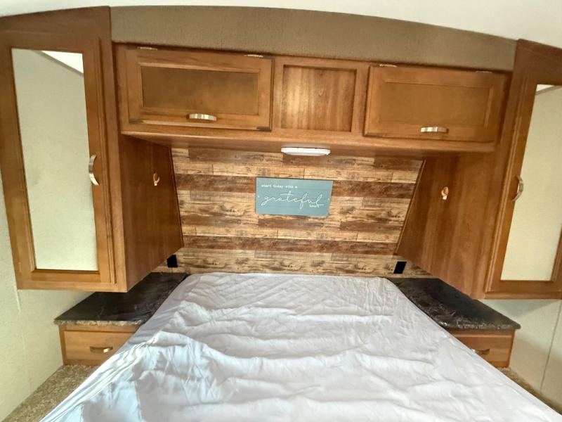The private front bedroom offers a quiet retreat with a queen bed for a comfortable night's rest, dual nightstands with closets above, plus overhead storage above the head of the bed as well. You can enter the bedroom from the hallway or bath. You will also find the exterior pass-through storage compartment beneath the bed area for all of your outdoor camping gear and larger items.