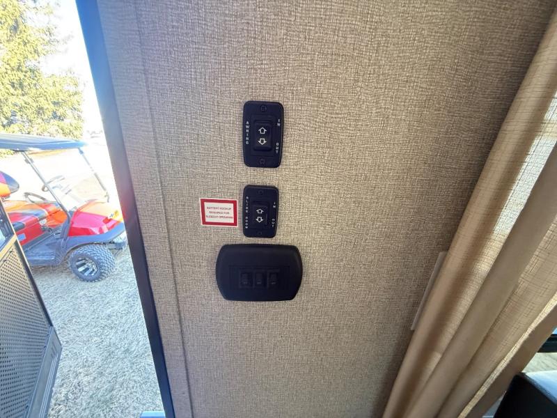 Opposite the door side there is a slide out tri-fold sofa with storage above, and a booth dinette for mealtime use. Both can easily be made into more sleeping space at night. The nearby entertainment center can be viewed from any seating in the room.