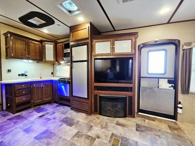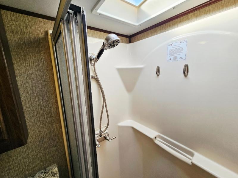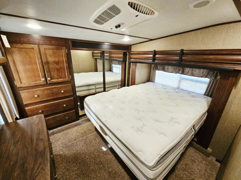 What I liked most: Rear entry into fifth wheel is different. Very open and spacious inside with plenty of cabinets in kitchen sink is angled toward the corner. Huge panoramic window behind the rear recliners. Bedroom has vent and for you to help with ventilation. Bathroom has a little bit of counterspace on both sides of the sink, a nice size vanity, and a walk-in shower with sky-light. Good amount of storage with wardrobe side cabinets and full dresser.