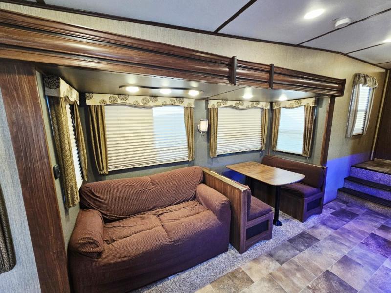 Step inside and be greeted by a wide open living area featuring two swivel rocking chairs along the rear wall that also includes an end table and overhead storage cabinets. You can choose two optional rocker recliners instead if you like. There is a tri-fold sleeper sofa and booth dinette slide opposite the door side. Enjoy the entertainment center featuring a 40" TV and fireplace just to the right of the entry door for your inside camping days.