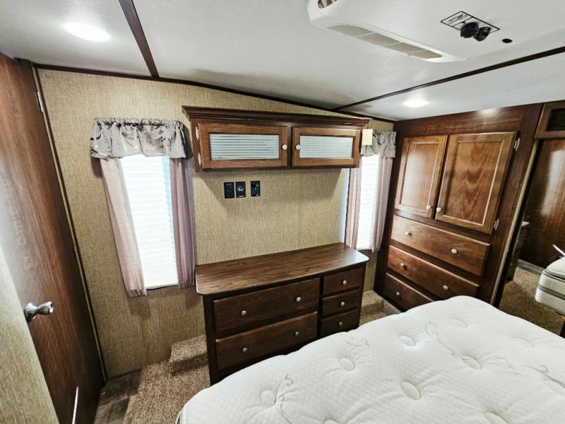 The private front bedroom features a slide out residential queen bed with overhead storage along the curb side, a dresser with overhead storage on the road side, and a full front wardrobe with sliding doors and a closet that has been prepped for a washer/dryer, plus so much more!