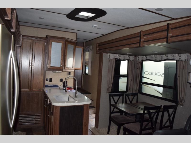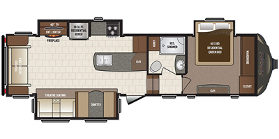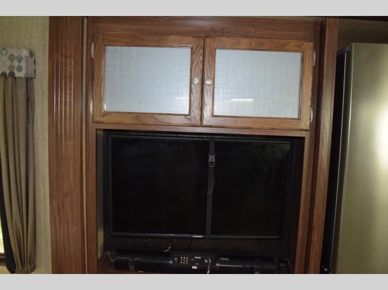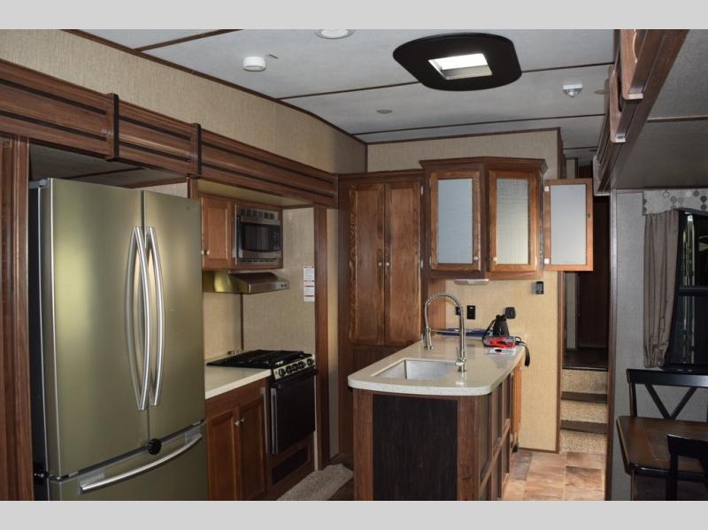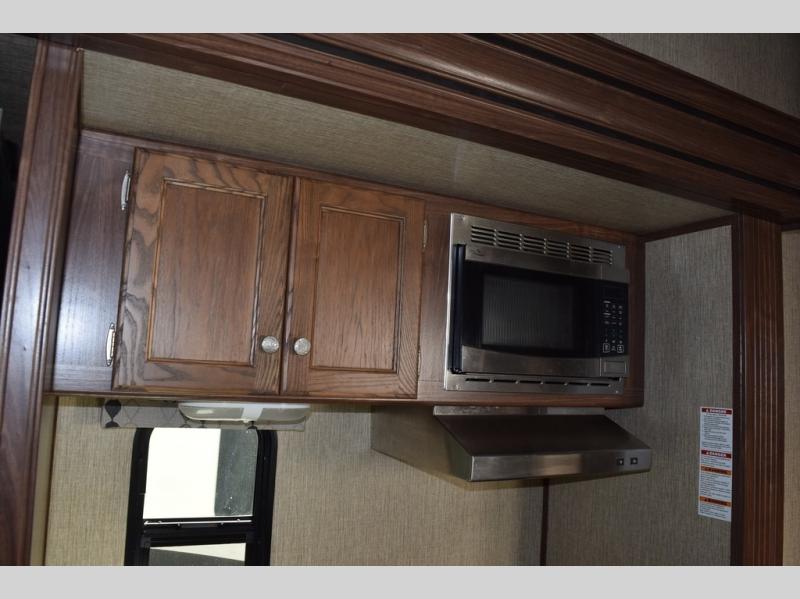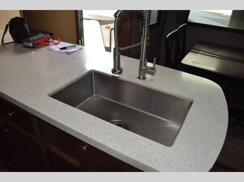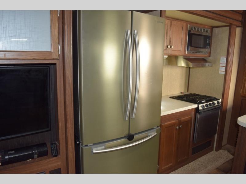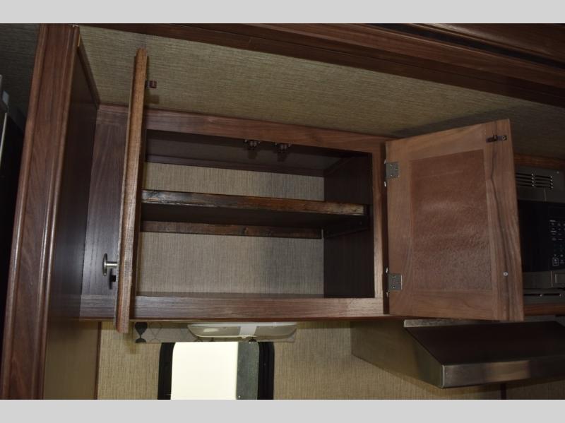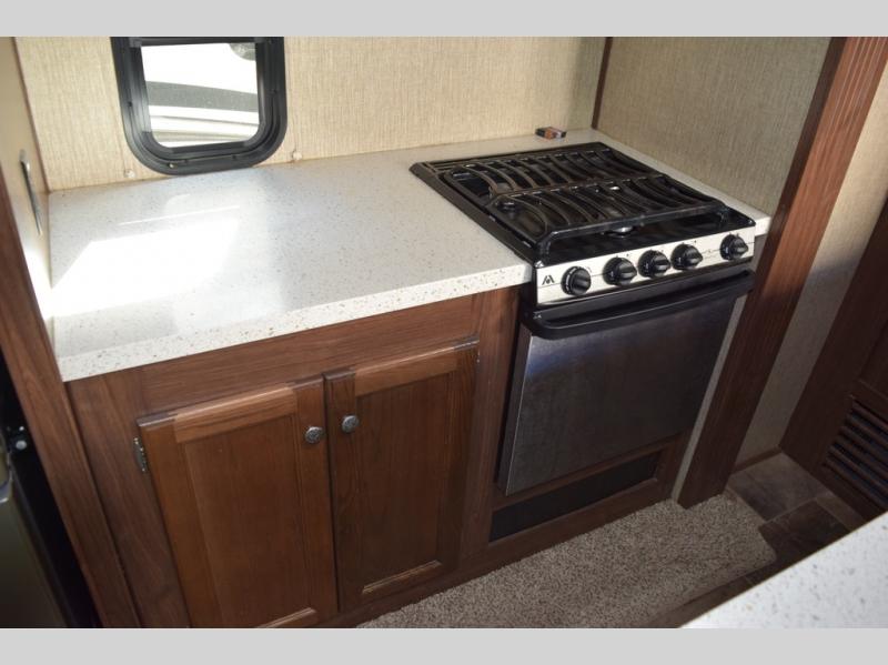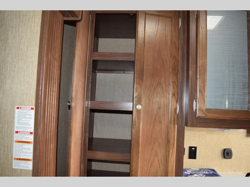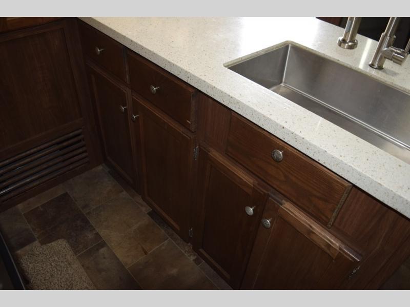 The kitchen provides everything you need to prepare and cook food for your family. There is a large L-shaped counter area with a sink on the end and overhead cabinets for all of your dishes and things, plus a slide out along the road side that includes a three burner range and 18 cu. ft. residential refrigerator. You will also find more storage space near the entertainment center that is mentioned above, plus so much more!