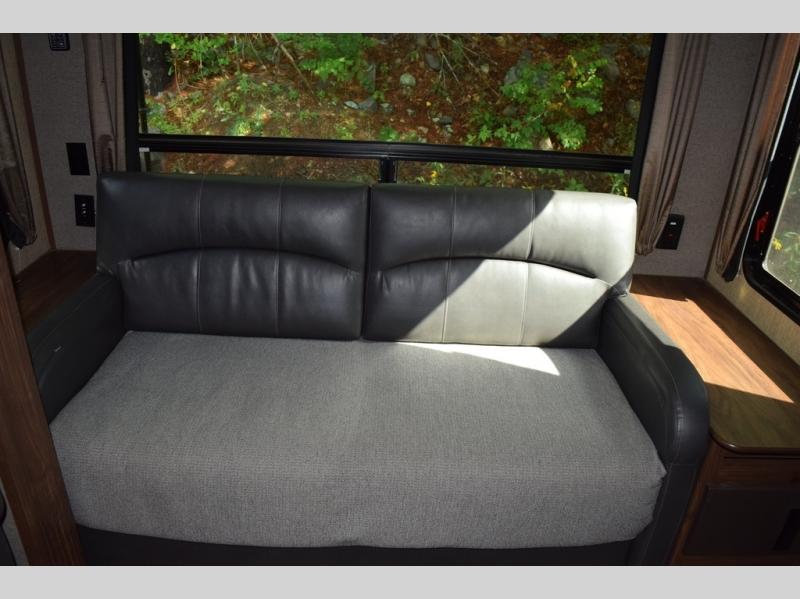 Head left at the entry door and find a booth dinette and theater seating slide out. There is more seating across the rear of this Sprinter with a tri-fold sleeper sofa and end tables. Adjacent to the sofa enjoy a slide out entertainment center with 40" TV including an electric fireplace beneath.