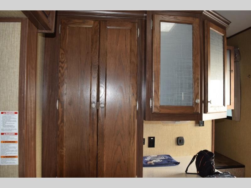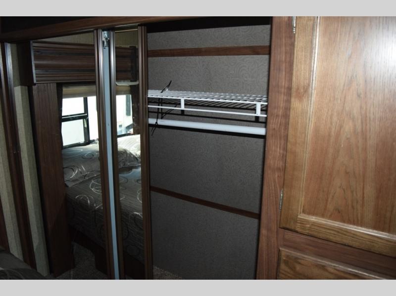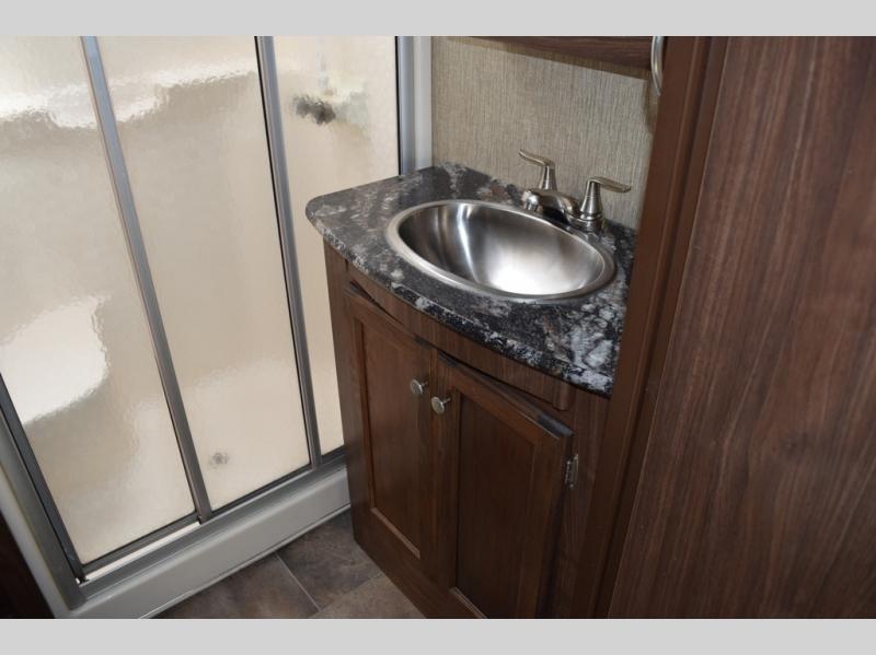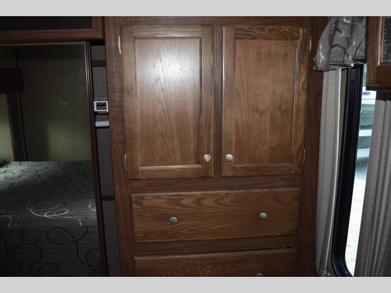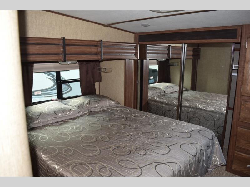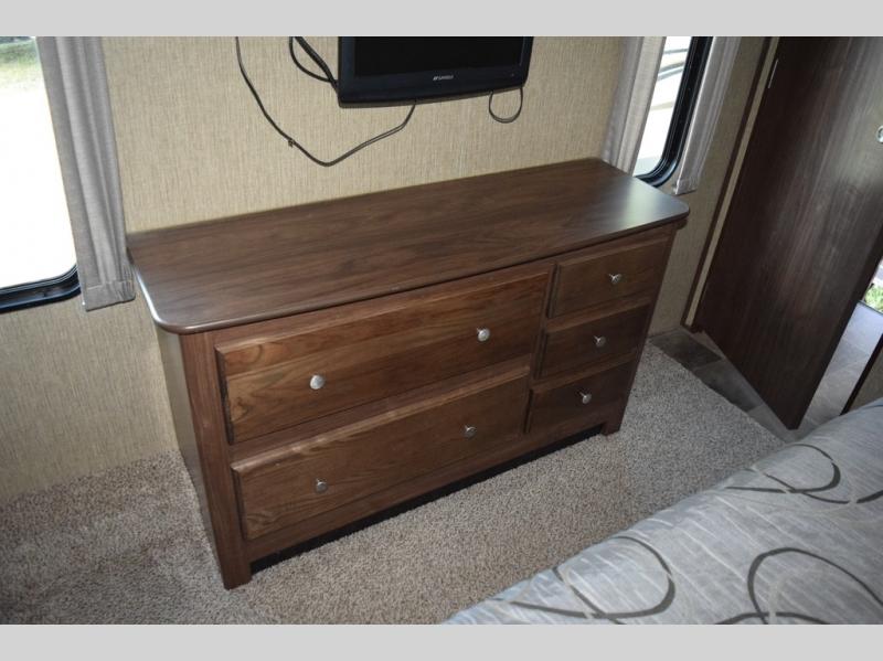 Enter model 298FWRLS and head up the steps on your right to the front master bedroom and side aisle bath. The bathroom offers a residential shower, toilet, sink, and linen cabinet. The private master bedroom at the end of the hall features a slide out residential queen size bed. There is also a dresser opposite, plus a front wall wardrobe and closet prepped for a washer/dryer for all of your clothing and storage needs.