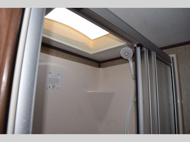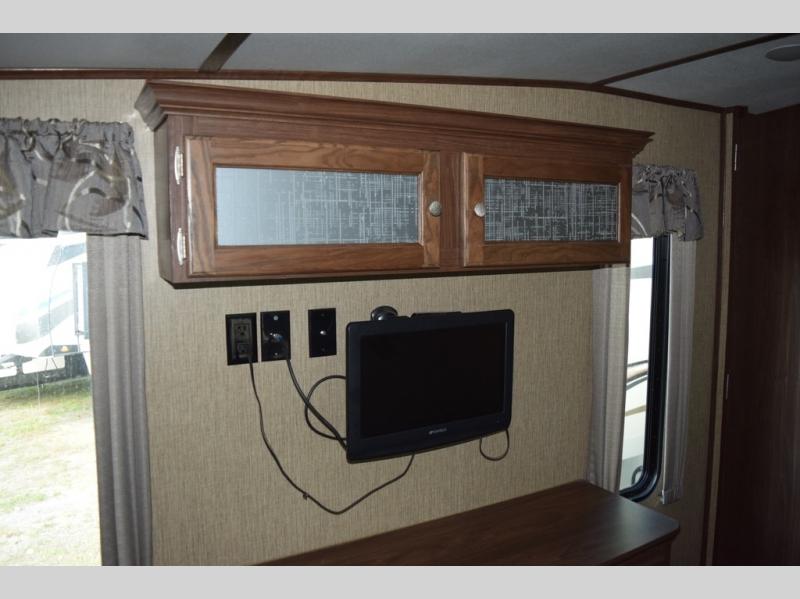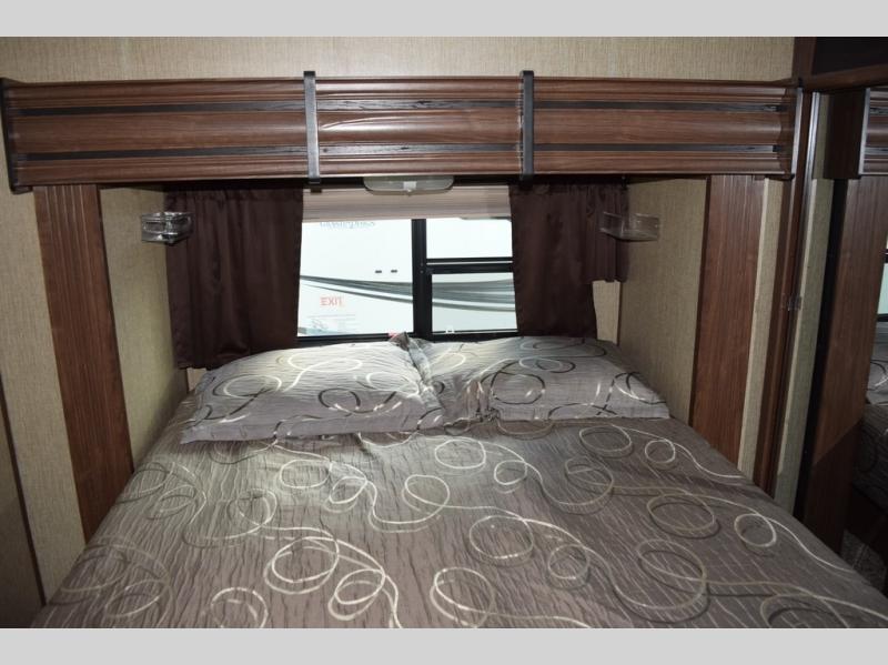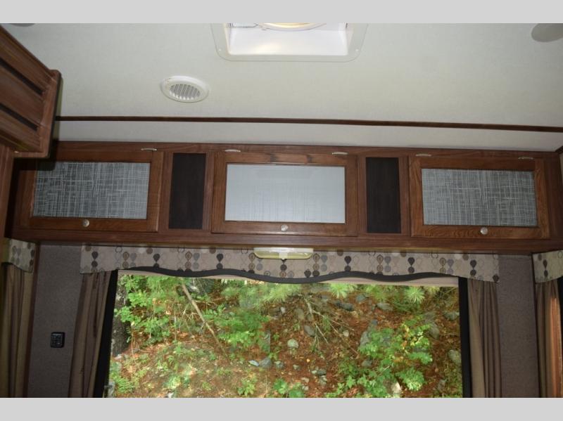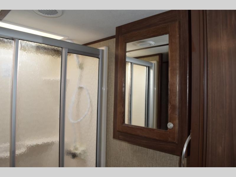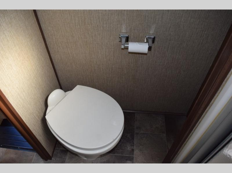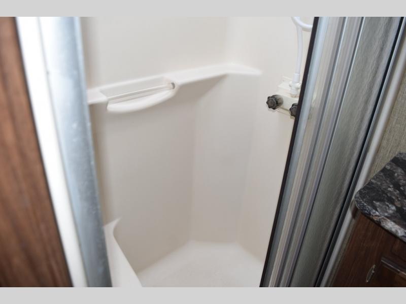 Enter model 298FWRLS and head up the steps on your right to the front master bedroom and side aisle bath. The bathroom offers a residential shower, toilet, sink, and linen cabinet. The private master bedroom at the end of the hall features a slide out residential queen size bed. There is also a dresser opposite, plus a front wall wardrobe and closet prepped for a washer/dryer for all of your clothing and storage needs.