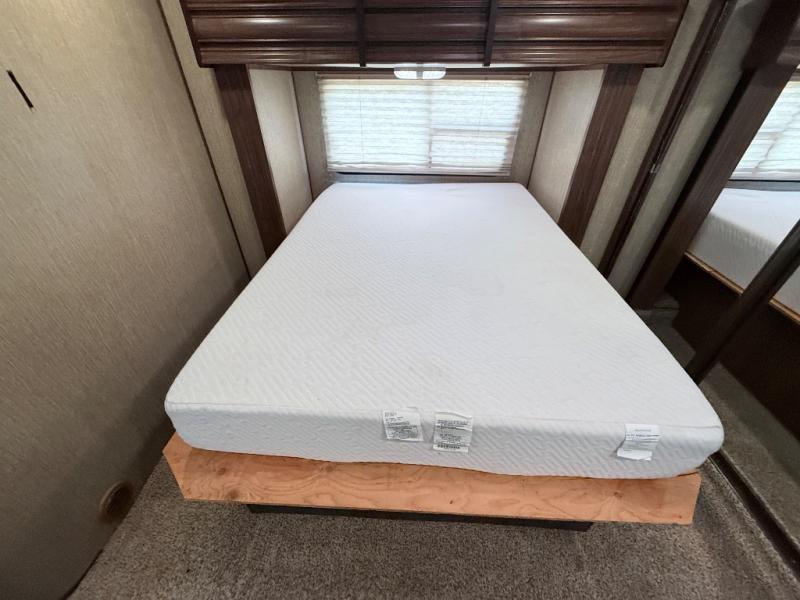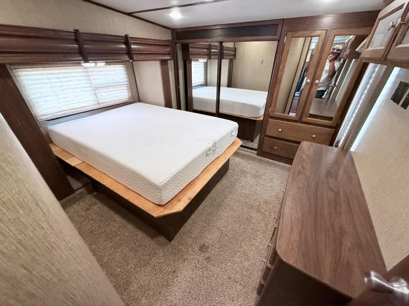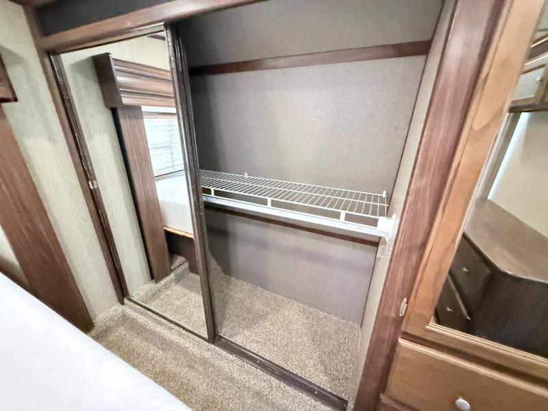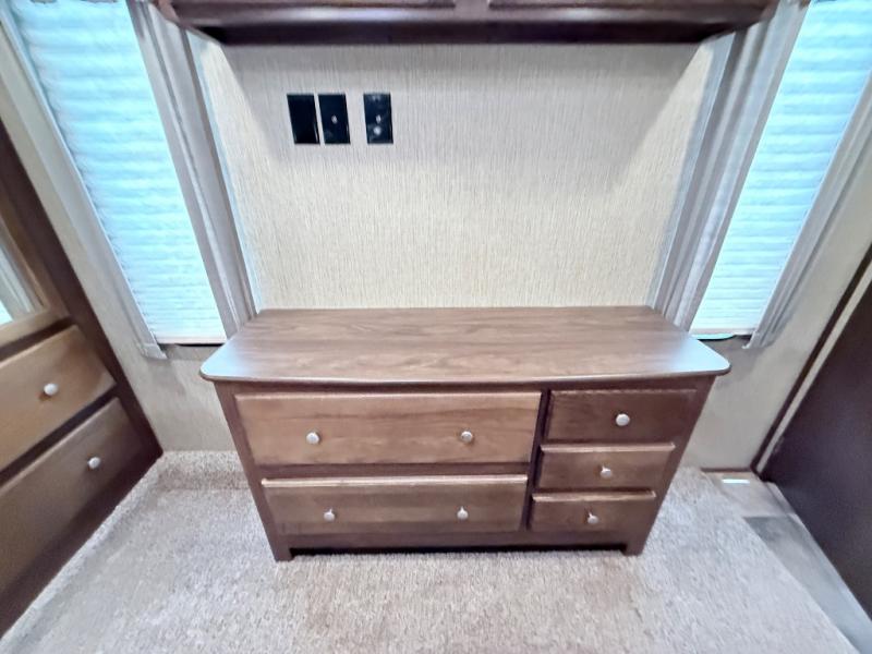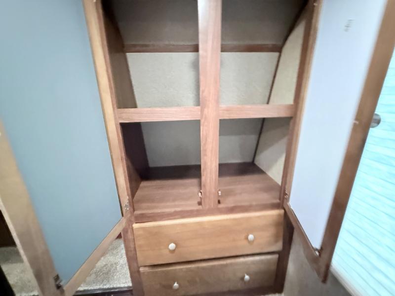 The front bedroom features a residential queen bed slide with dresser opposite, plus a wardrobe and closet space for all of your things across the front wall.