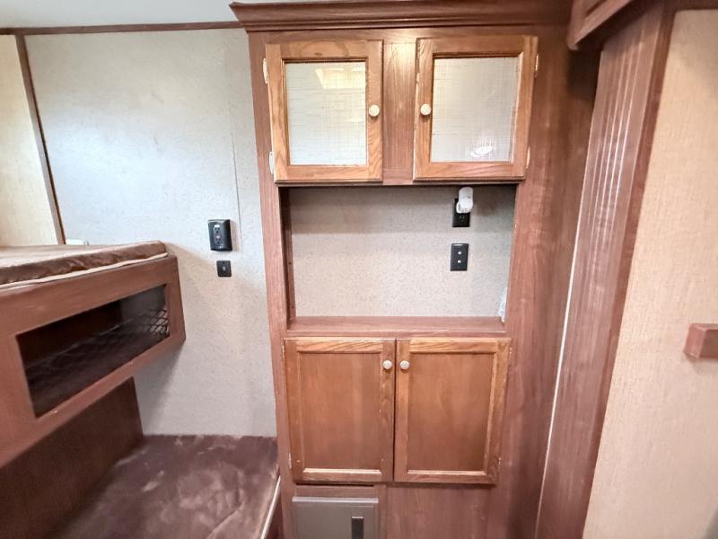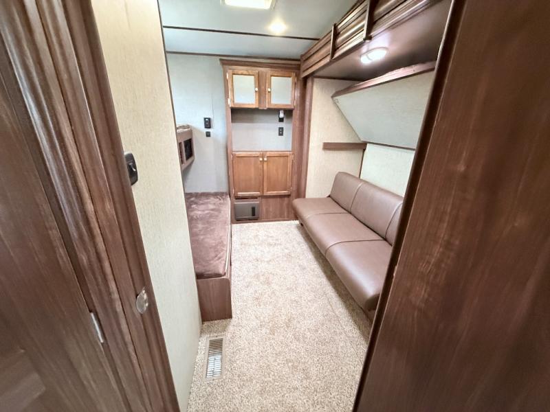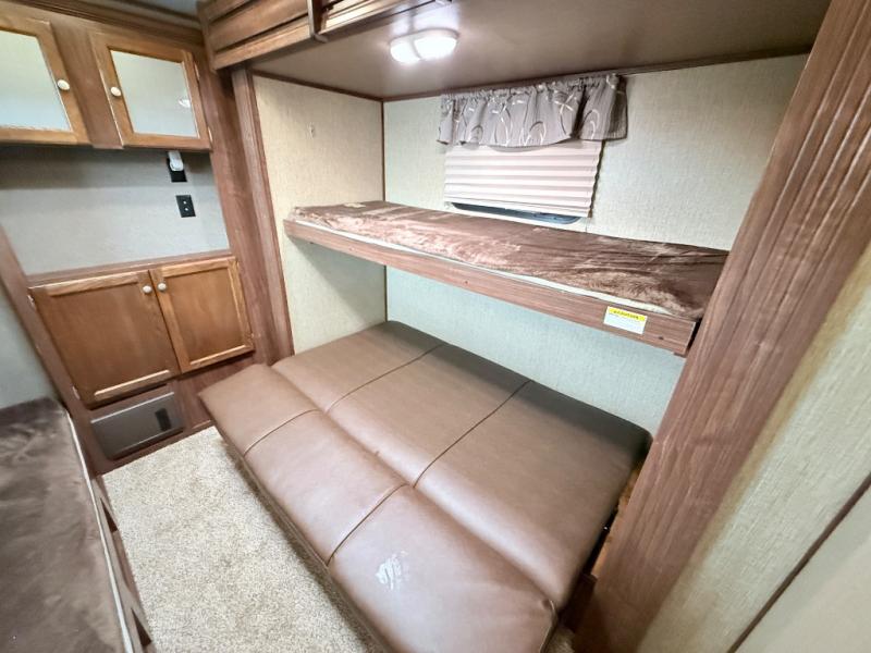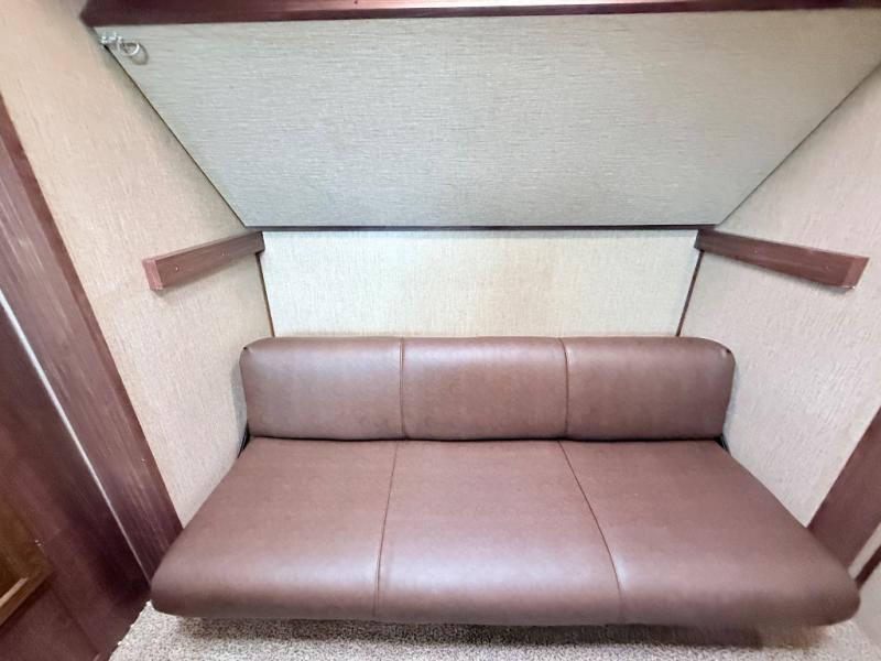 The rear bunkhouse features a flip-over sofa slide with bunk above, and three drawers beneath. On the left side find a lower bunk with a toy box, a 36" x 74" bunk in the middle, and an overhead bunk above making this private bunk space easily sleep five! The entertainment center is located in between the sets of bunks along the rear wall.