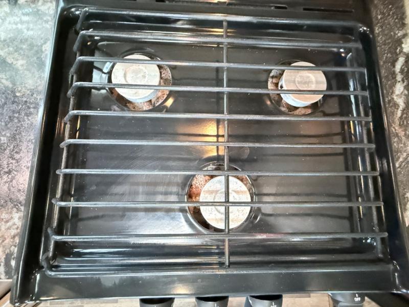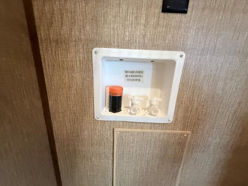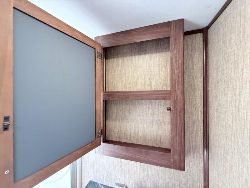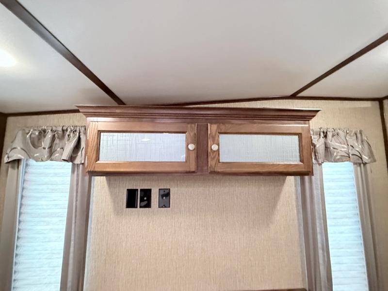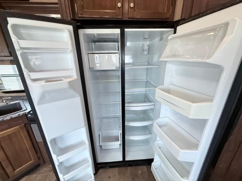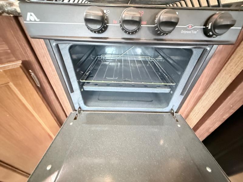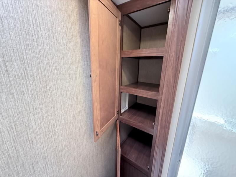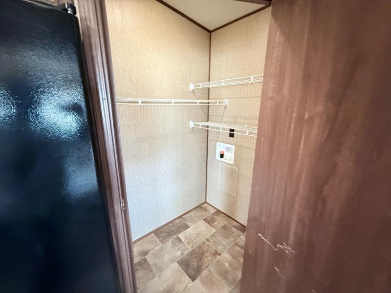 The kitchen features a large walk-in utility room with shelves and storage for dry goods plus it is prepped for a washer and dryer if you choose to add the appliances for more camping convenience. An 18 cu. ft. residential refrigerator, a three burner range, and a sink on an angled counter-top completes the kitchen. You will have no trouble creating meals and snacks for your hungry crew in this space.