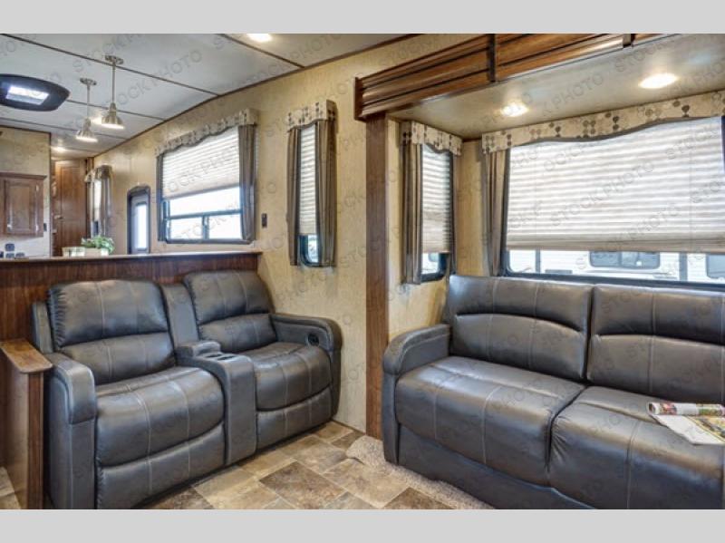 Continue towards the rear of this model to the den area to find theater seating for two facing the rear wall entertainment center which features a 55" TV, and a fireplace. There is more seating and sleeping space with the dual slide out tri-fold sleeper sofas on each side of the room, plus so much more.