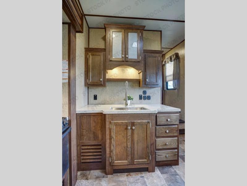 Heading towards the kitchen area you will find a dinette with booth seating along the curb side wall and three chairs on the opposite side. Along the interior wall find a kitchen sink with counter space on both sides plus overhead storage for your dishes and things. The kitchen continues to provide everything you need to prepare and cook food for your family including a slide out three burner range, an 18 cu. ft. residential refrigerator, and a pantry for your non-perishables.