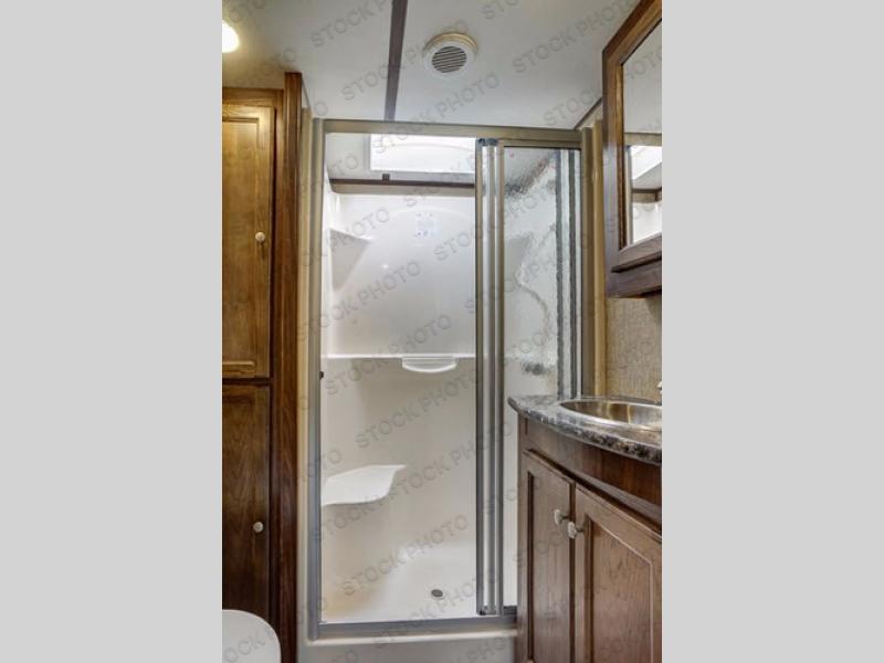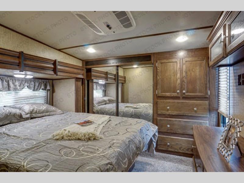 Enter model 353FWDEN and head up the steps on your right to the front master bedroom and side aisle bath. The bathroom offers a residential shower, toilet, sink, and linen cabinet. The private master bedroom at the end of the hall features a slide out residential queen size bed. There is also a dresser opposite, and full front wall wardrobe and closet prepped for a washer/dryer for all of your clothing storage needs.