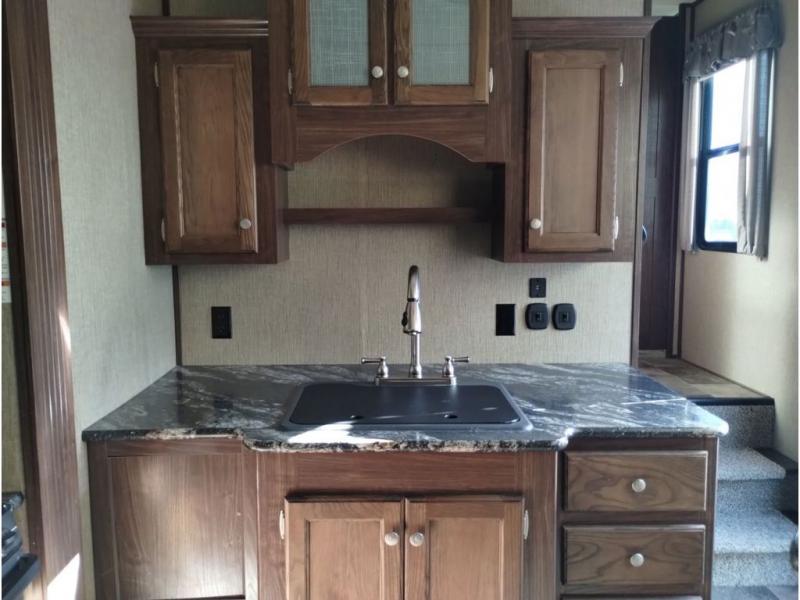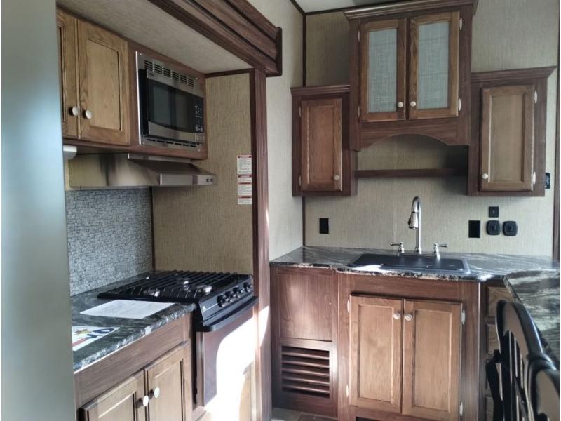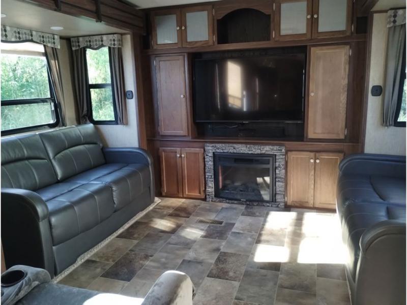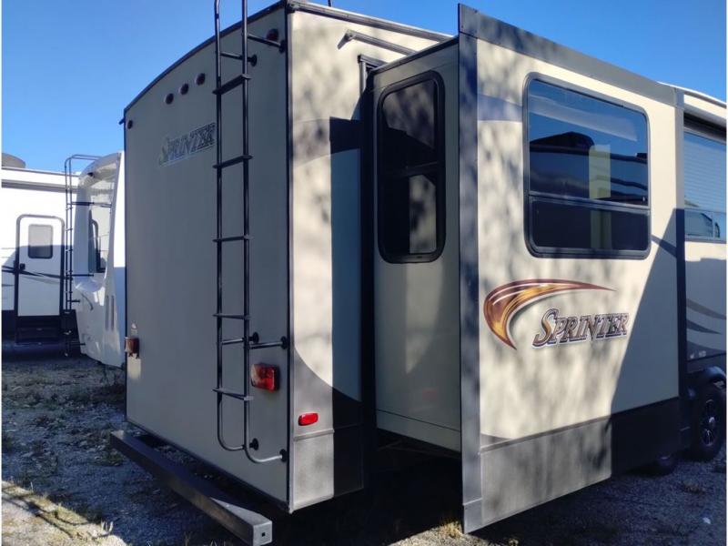 This Keystone Sprinter fifth wheel features a wide body design with quadruple slides which increases the size even more when all slides are fully extended. You are sure to love the den area with the rear entertainment center and fireplace.