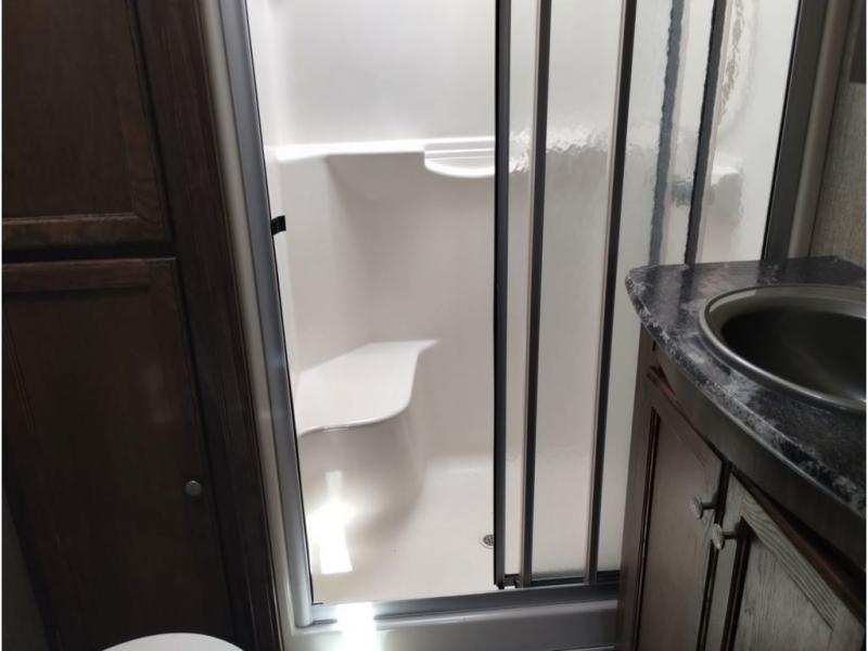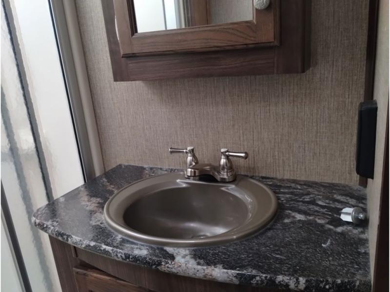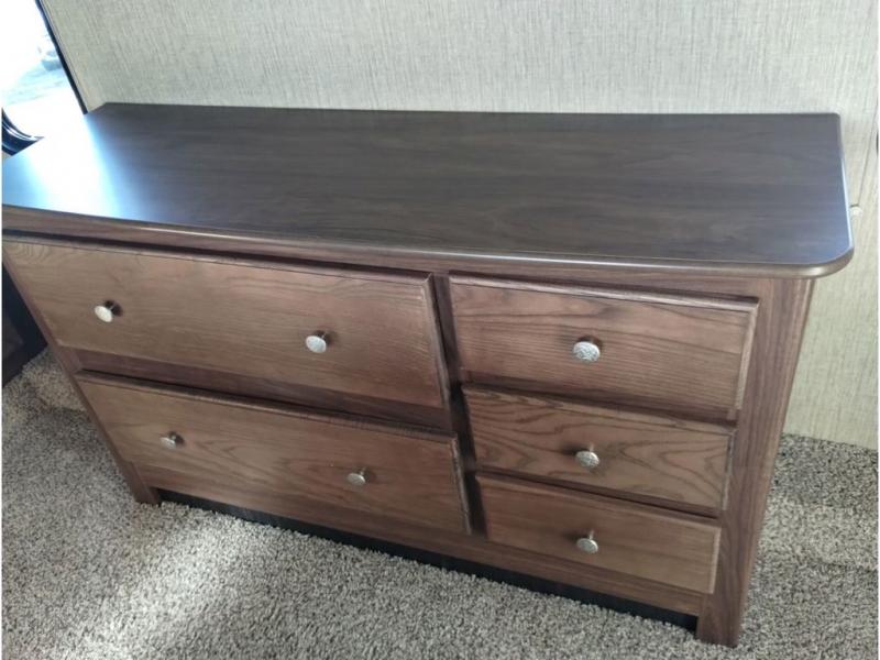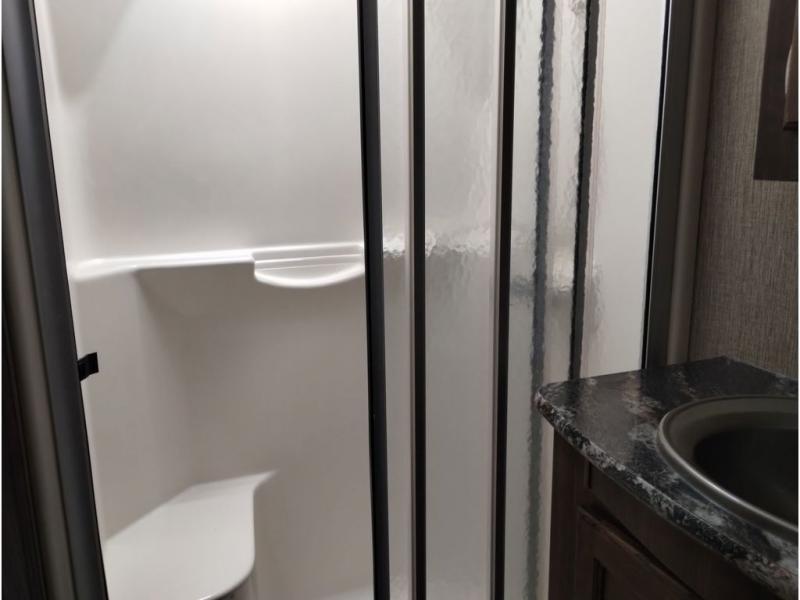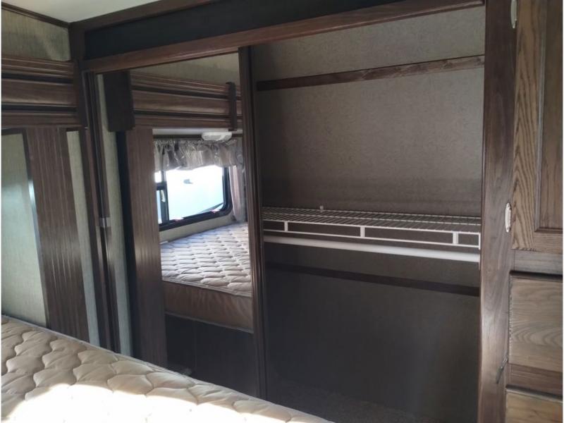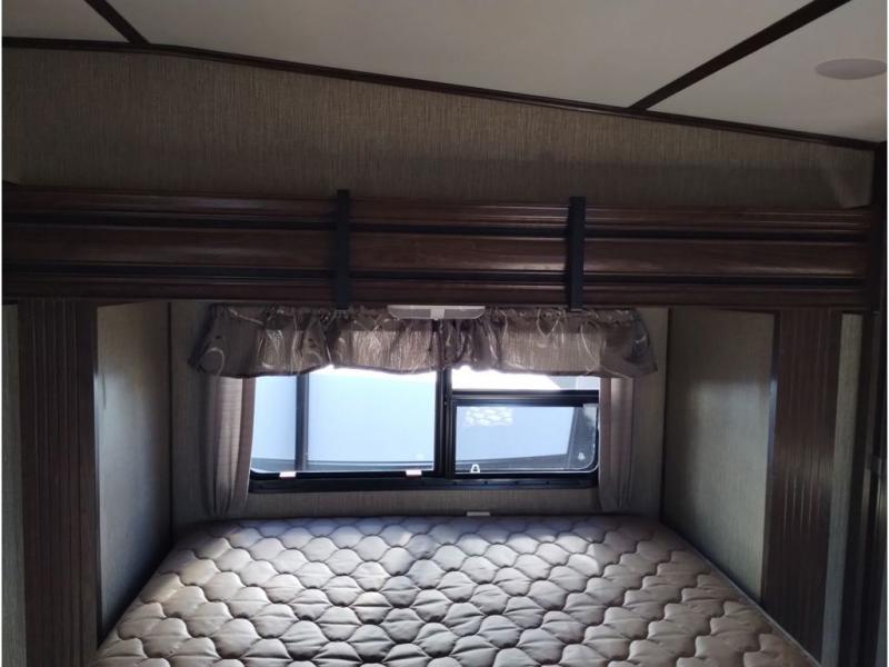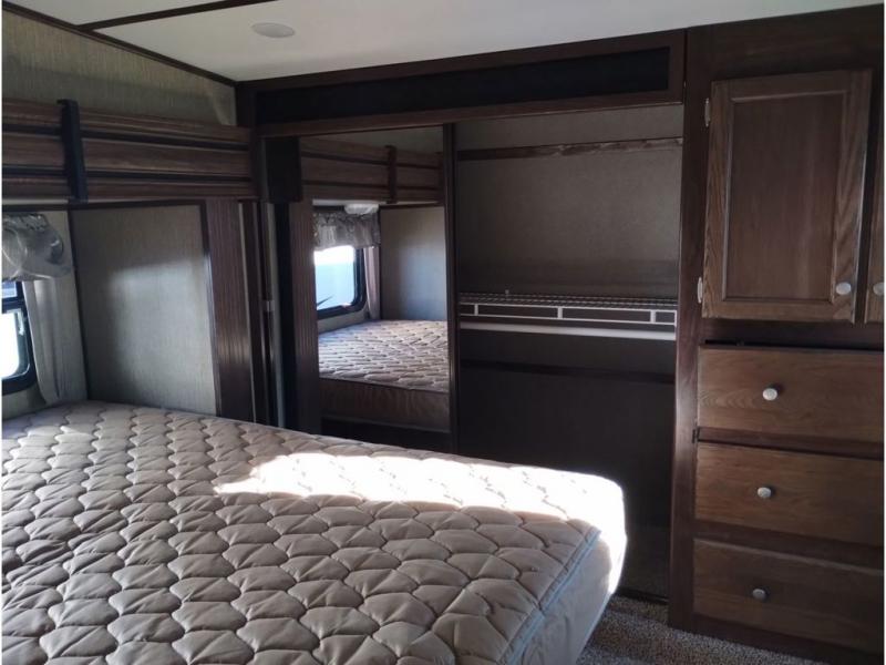 Enter model 353FWDEN and head up the steps on your right to the front master bedroom and side aisle bath. The bathroom offers a residential shower, toilet, sink, and linen cabinet. The private master bedroom at the end of the hall features a slide out residential queen size bed. There is also a dresser opposite, and full front wall wardrobe and closet prepped for a washer/dryer for all of your clothing storage needs.