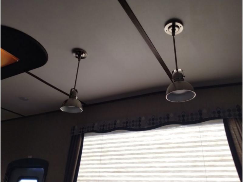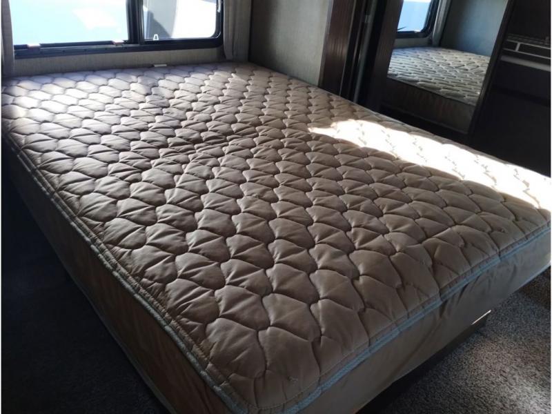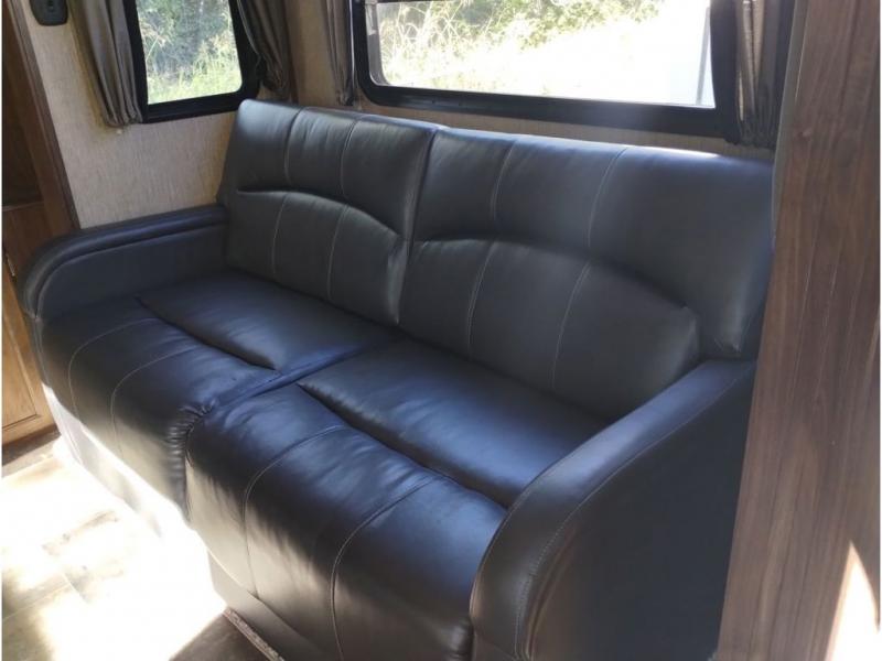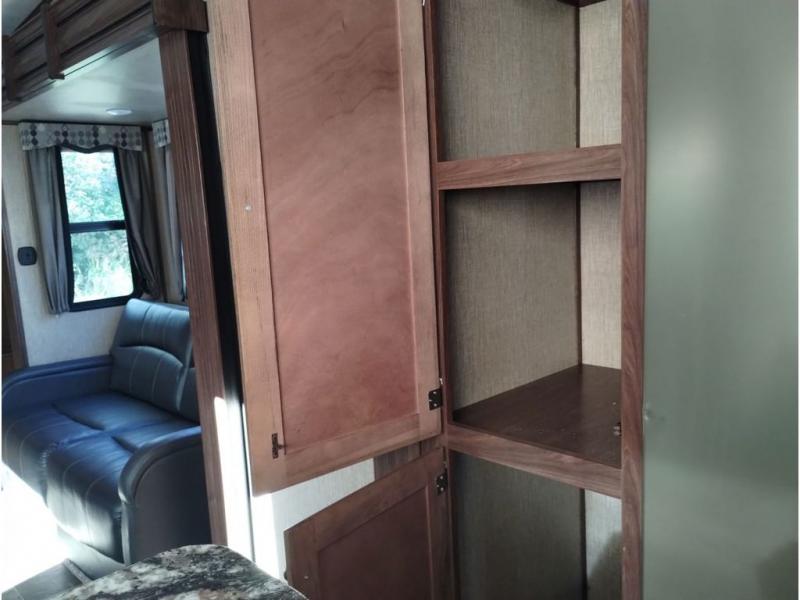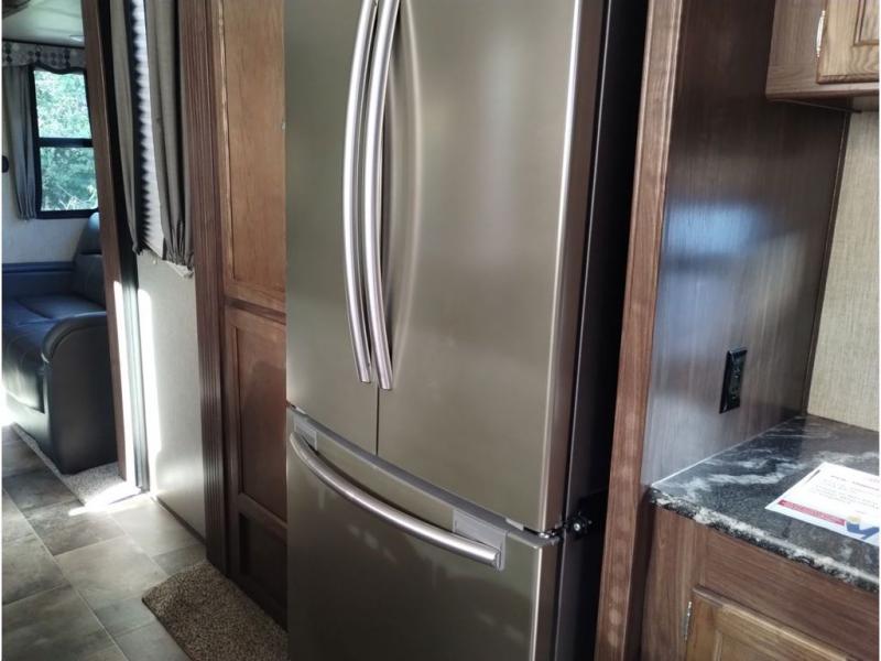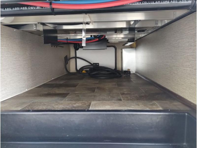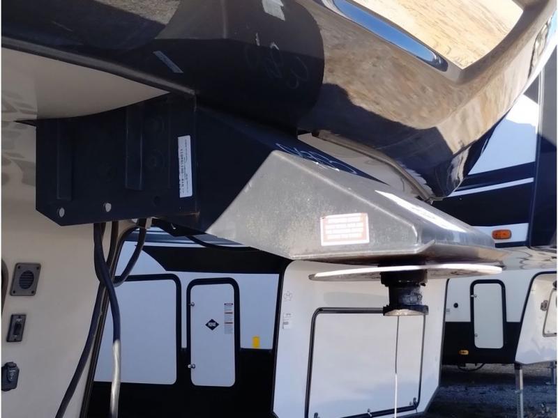 Enter model 353FWDEN and head up the steps on your right to the front master bedroom and side aisle bath. The bathroom offers a residential shower, toilet, sink, and linen cabinet. The private master bedroom at the end of the hall features a slide out residential queen size bed. There is also a dresser opposite, and full front wall wardrobe and closet prepped for a washer/dryer for all of your clothing storage needs.