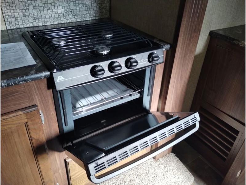 Heading towards the kitchen area you will find a dinette with booth seating along the curb side wall and three chairs on the opposite side. Along the interior wall find a kitchen sink with counter space on both sides plus overhead storage for your dishes and things. The kitchen continues to provide everything you need to prepare and cook food for your family including a slide out three burner range, an 18 cu. ft. residential refrigerator, and a pantry for your non-perishables.