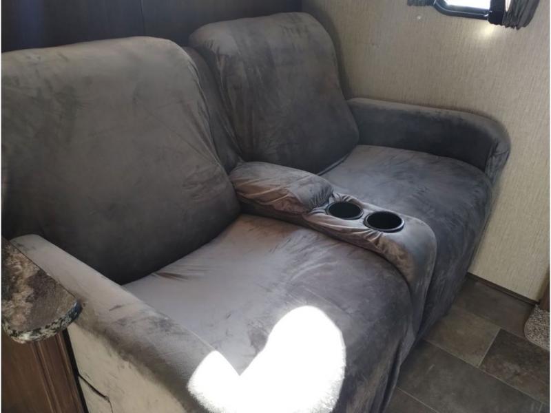 Continue towards the rear of this model to the den area to find theater seating for two facing the rear wall entertainment center which features a 55" TV, and a fireplace. There is more seating and sleeping space with the dual slide out tri-fold sleeper sofas on each side of the room, plus so much more.