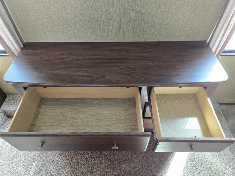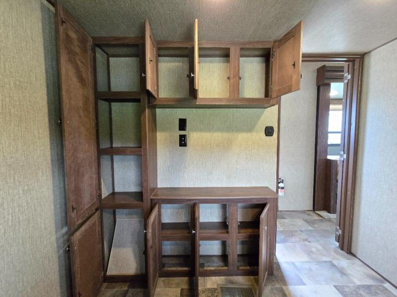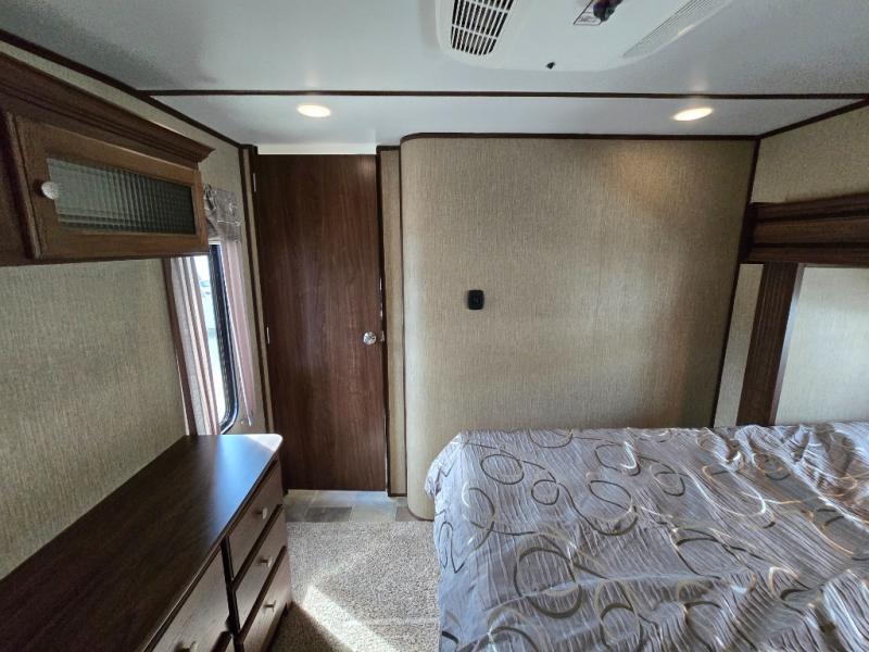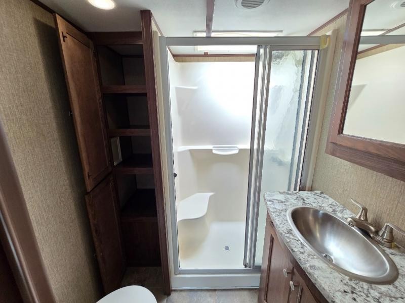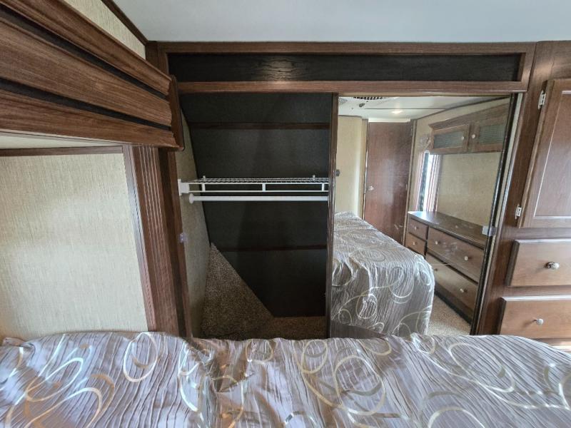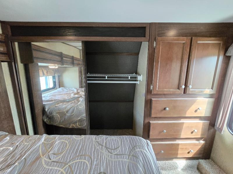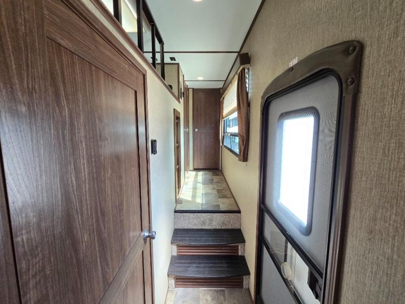 Up the steps to your right through the same entry door you will find a bathroom through the first door on your left. Inside enjoy the convenience of a residential shower, toilet, and sink. There is also a linen cabinet for your towels and other bath products. At the head of the hall find a spacious master bedroom featuring a slide out queen size residential bed, a dresser opposite along the curb side wall, and a front wardrobe for your clothing. There is also a second closet along the front that features a space prepped for a washer and dryer if you choose to add the appliances.