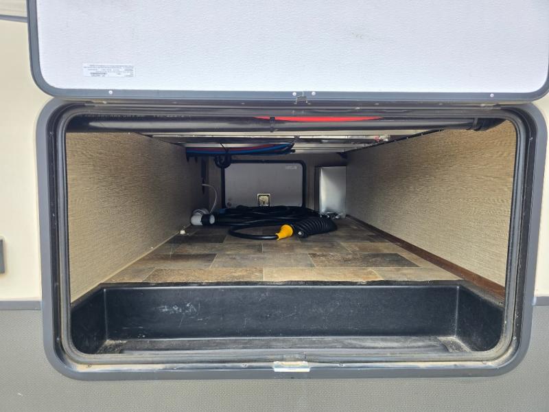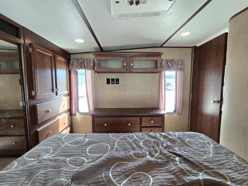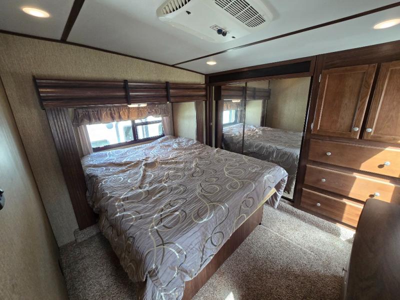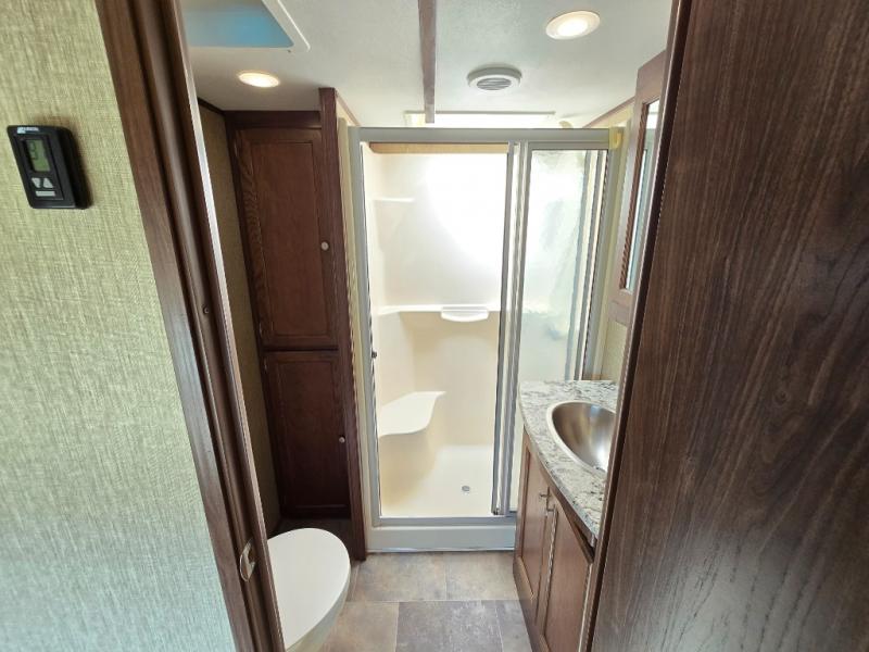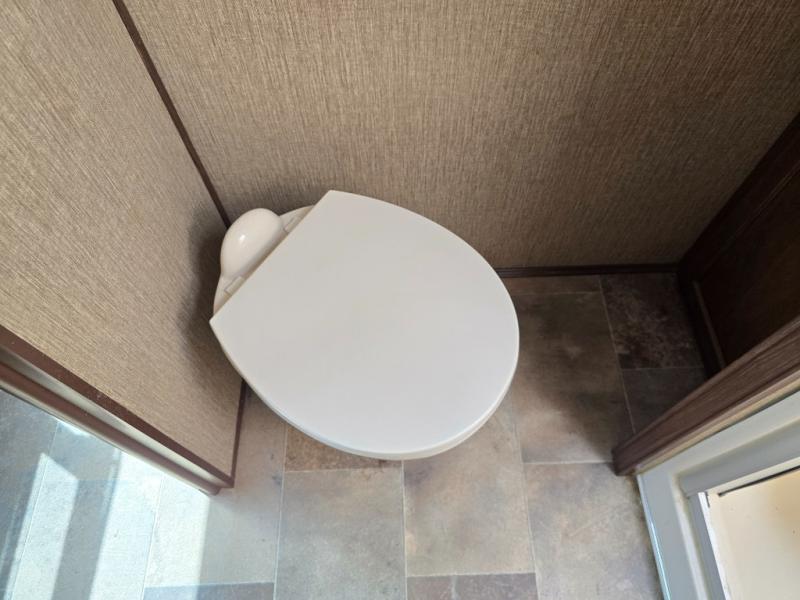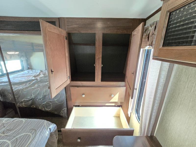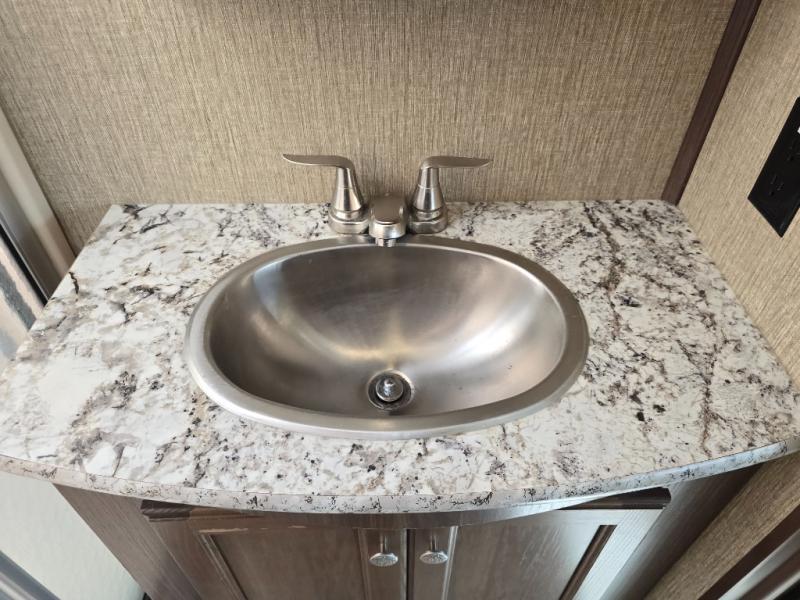 Up the steps to your right through the same entry door you will find a bathroom through the first door on your left. Inside enjoy the convenience of a residential shower, toilet, and sink. There is also a linen cabinet for your towels and other bath products. At the head of the hall find a spacious master bedroom featuring a slide out queen size residential bed, a dresser opposite along the curb side wall, and a front wardrobe for your clothing. There is also a second closet along the front that features a space prepped for a washer and dryer if you choose to add the appliances.