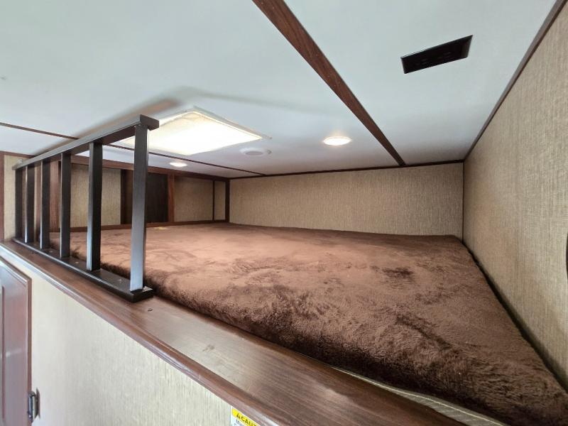 Enter and step into the middle bedroom/den area straight ahead. There is a slide out tri-fold sofa sleeper along the road side wall. Opposite along the interior wall find storage for your things. There is a loft above with a 60" x 80" sleeping space that the kids are sure to love accessible using the ladder out in the front hall.