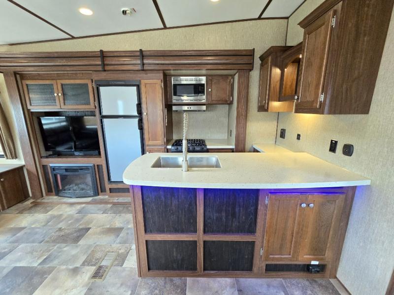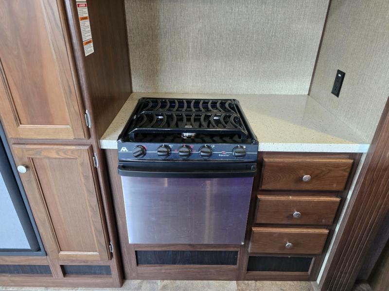 Back at the entry turn left and enter a spacious combined rear living area and kitchen. The kitchen space is closest to the door with a slide out dinette and theatre seat to your immediate left. Along the interior wall you will find a counter peninsula with a large sink, and storage. Along the road side a slide out three burner range, pantry, and refrigerator will allow you to easily cook meals and snacks for your family. This all sits nicely with the entertainment center and 40" HDTV.
