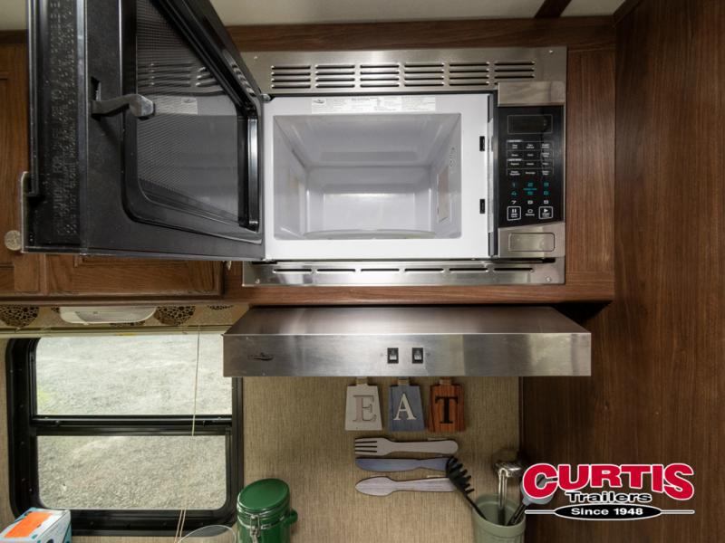 Step inside and find a spacious interior due to the slide which includes a tri-fold sofa sleeper, and booth dinette. There is a 32" TV straight in the door along the interior wall. To the right of the door find a lounge chair, and the start of the kitchen appliances which includes a 7 cu. ft. refrigerator, and a three burner range. The counter continues along the front wall and features an angled double sink in the front curb side corner. There is plenty of prep space and storage both above and below the counter-top, and it ends with a pantry in the road side front corner.