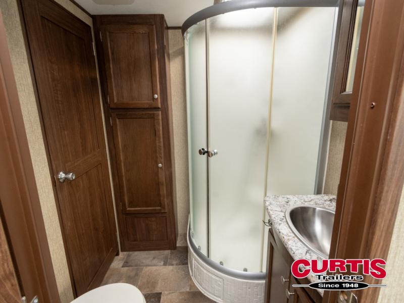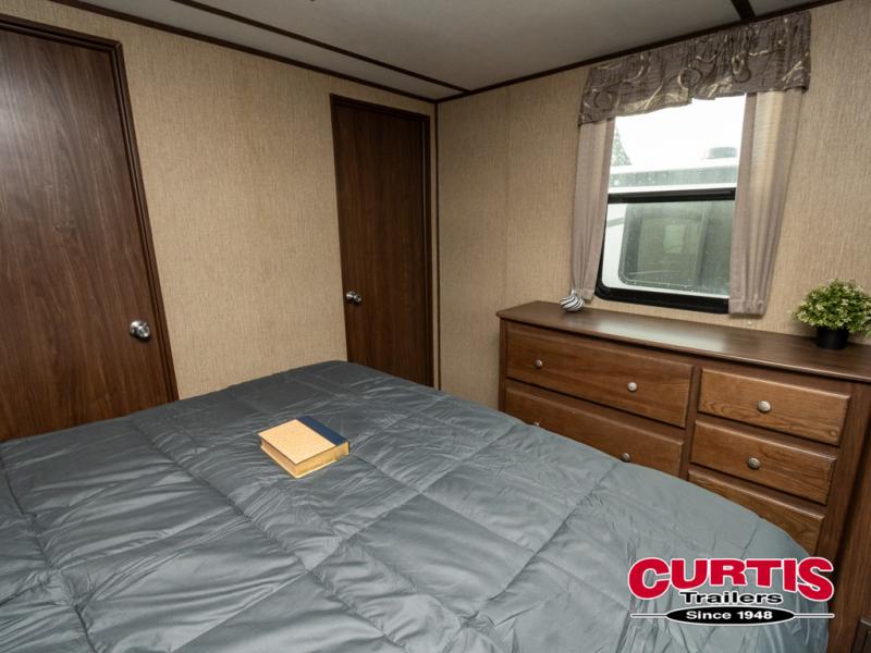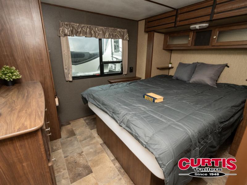 The private bedroom features a slide out residential size queen bed with overhead cabinets, a dresser, and a wardrobe, plus so much more.