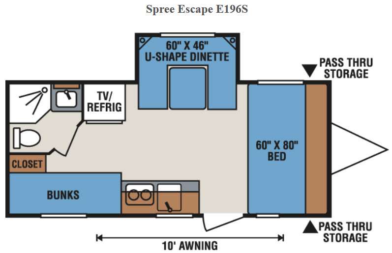 If a set of bunk beds, a u-shaped dinette slide out, and a queen size bed are what you have been looking for, this Escape Spree E196S travel trailer by KZ completes your search!