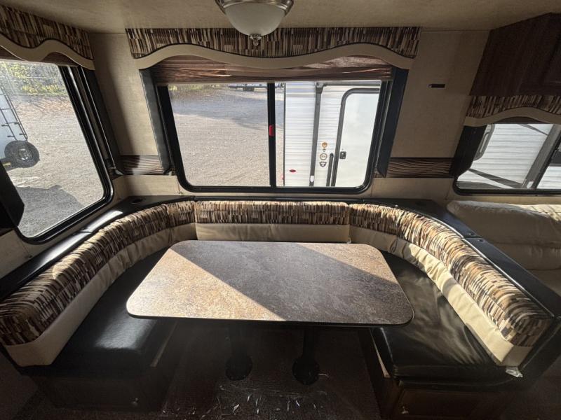 As you enter the travel trailer, to the left there is a double kitchen sink, three burner range, refrigerator, pantry, and a closet. The opposite side of the travel trailer has a u-dinette and sofa slide. You are also sure to enjoy the entertainment center which is located along the front interior wall of the main living area.