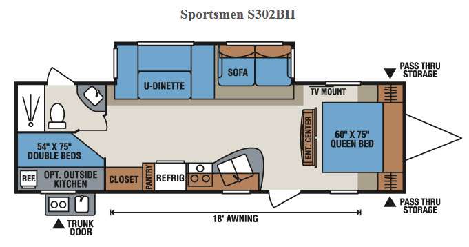 The Sportsmen S302BH travel trailer by KZ offers dual entry with one entrance along the curb side and one entrance on the road side, a rear bath and rear set of bunks, plus much much more!