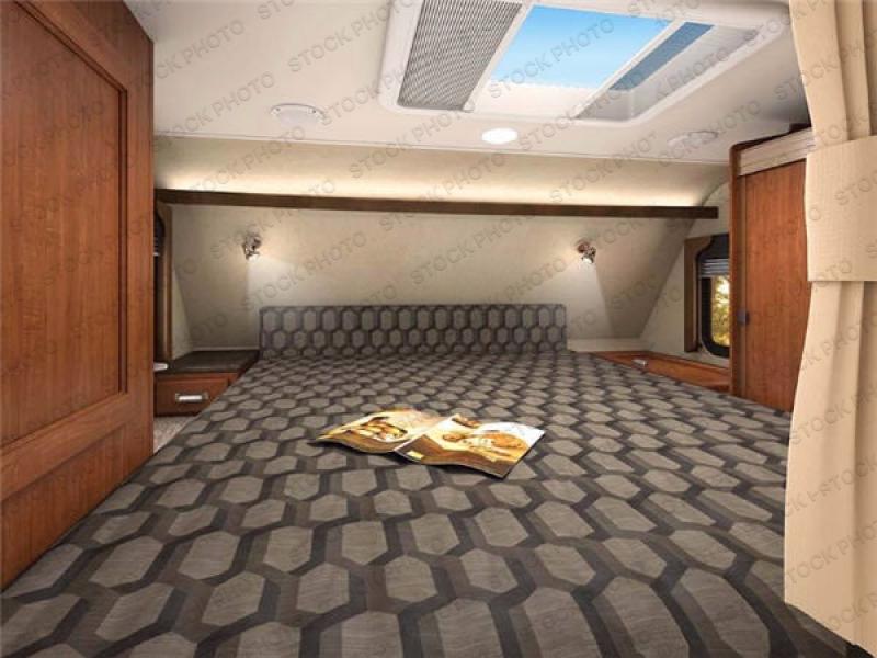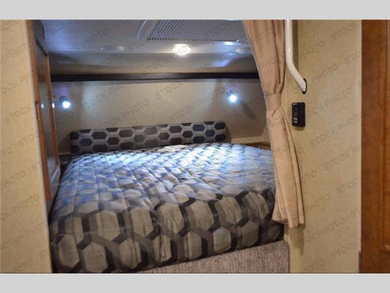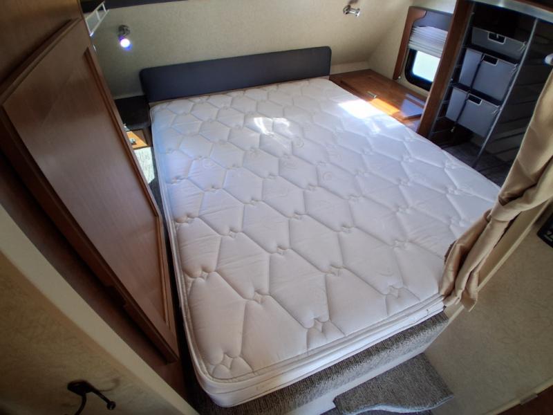 Step up to a cabover queen size bed in front featuring a large wardrobe on the right, as well as a hamper just beyond the wardrobe. On the opposite side of the bed you will find another cabinet, and additional storage area.