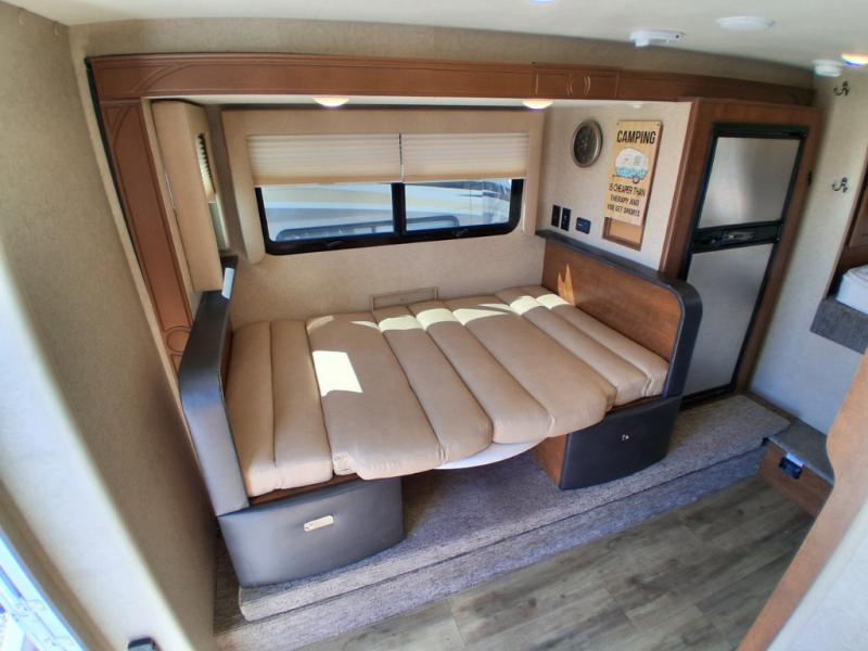 Step inside and notice the storage cabinet to your left. Next, the dinette and refrigerator slide along this same side (road side) helps to open up the floor space.
