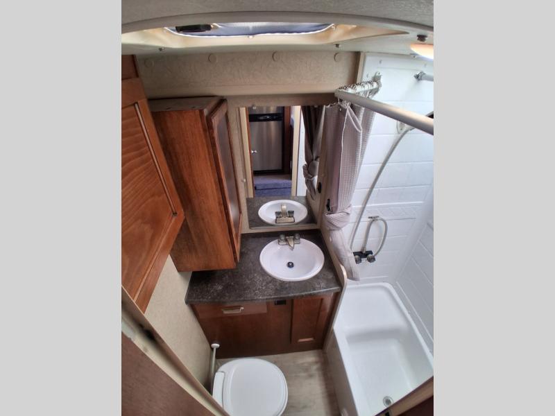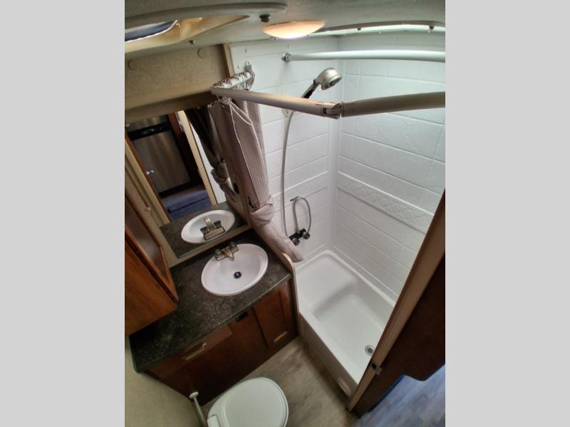 The bath is located toward the step up in front and features a shower, a toilet, with an overhead, and a sink with overhead medicine cabinet.