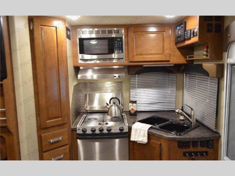 The kitchen area offers everything you need to easily prepare and cook food while you are adventuring. There is a three burner range, double a kitchen sink, overhead storage, and a nice size pantry for your canned goods.