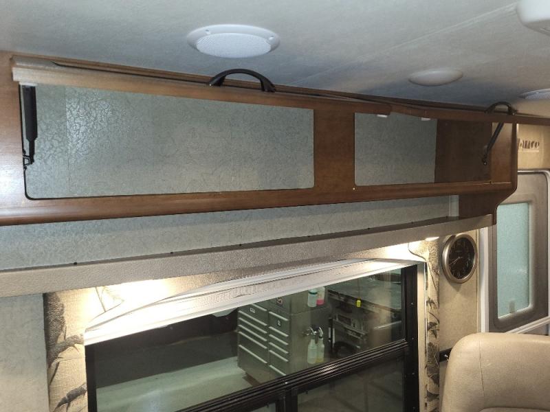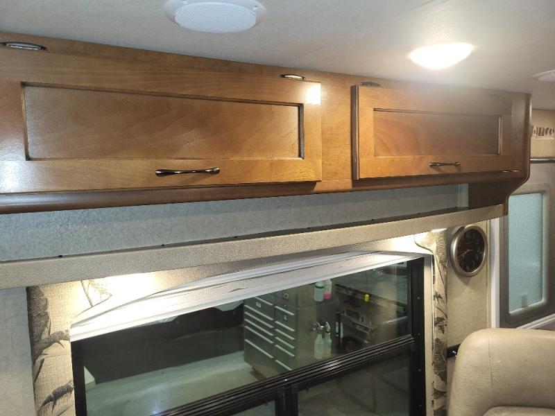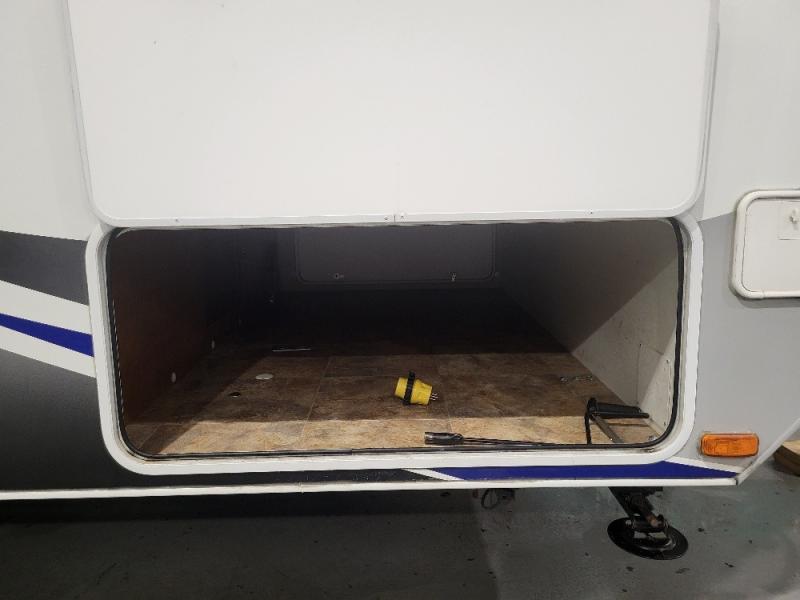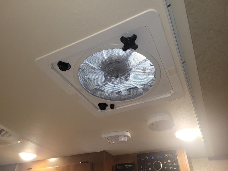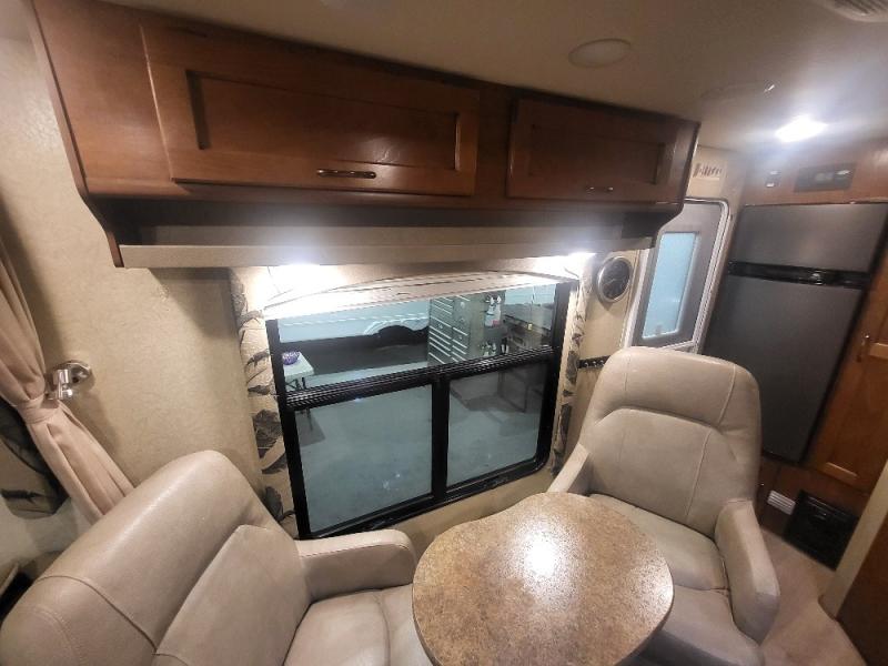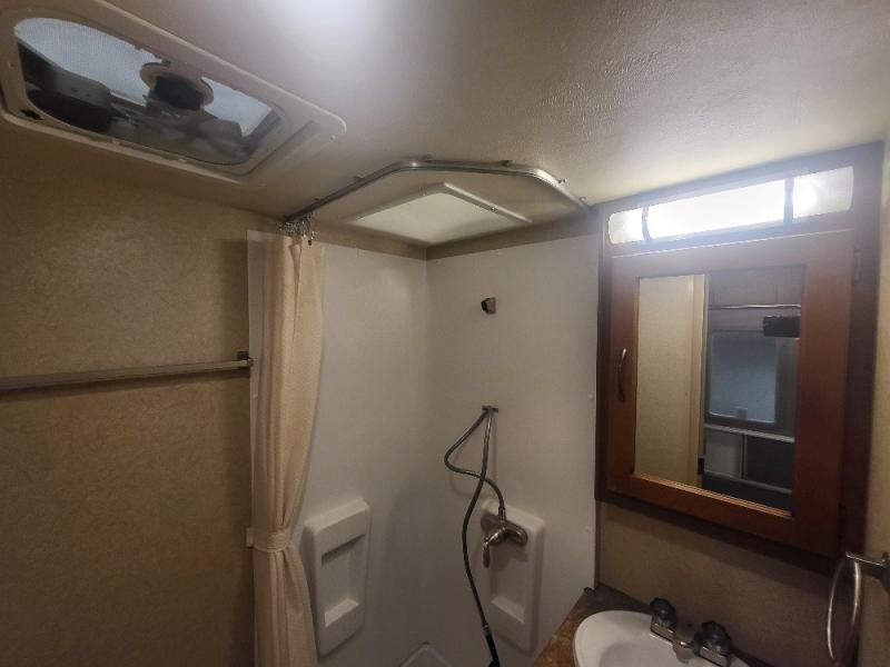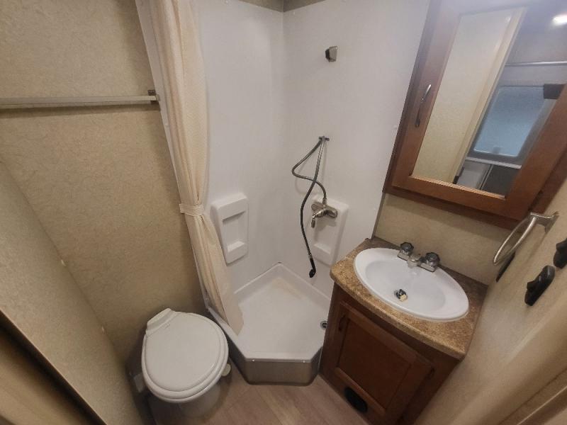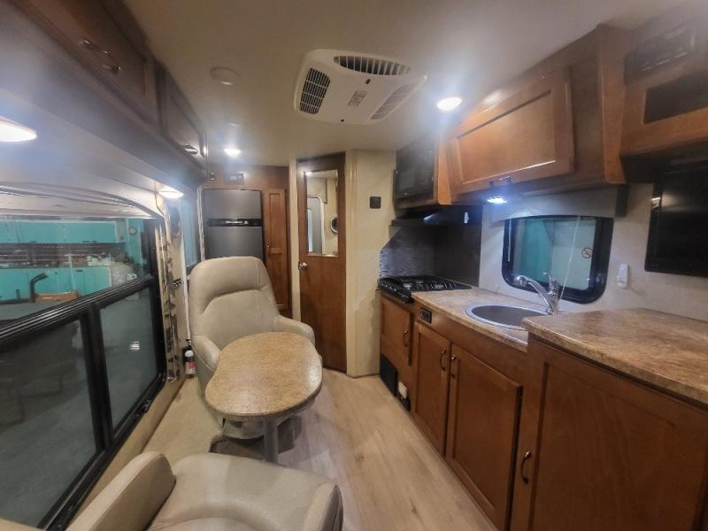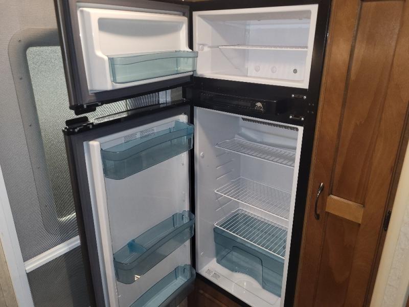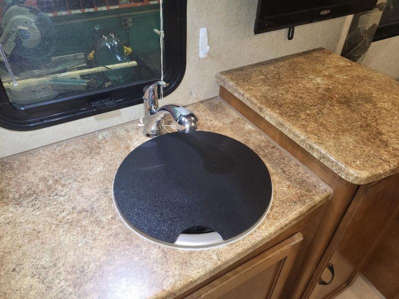 When it's time to sit and relax, or grab a bite to eat, the dual swivel rockers with table between may become your favorite spot in the trailer. You are sure to enjoy the overhead cabinets as well for all of your storage needs.