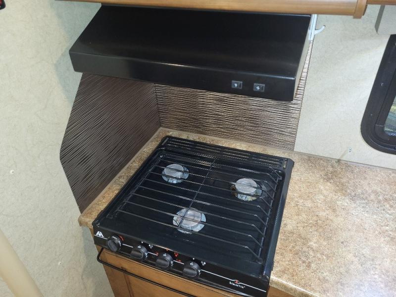 Step inside to find a refrigerator and storage cabinet to your left along the rear of the trailer. Along the road side wall you will find the kitchen amenities which provide a three burner range, counter-top space, and a round galley sink, plus there are overhead cabinets for your pots and pans. You may also choose to add a microwave if you wish.