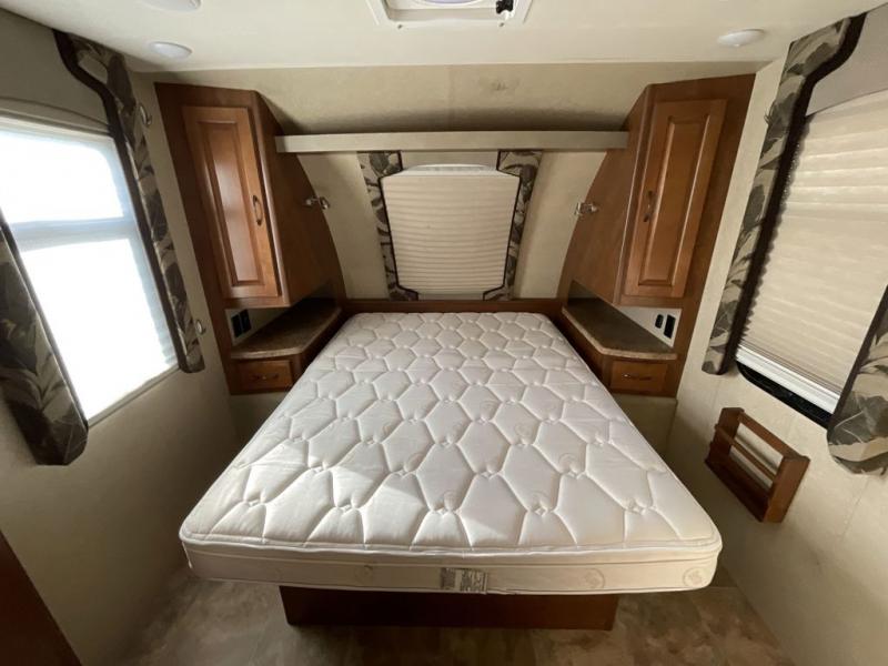 Up front enjoy a restful night's sleep on the queen bed provided. There are wardrobes and nightstands on either side of the bed, and an overhead cabinet plus a privacy curtain. Near the refrigerator you will find a space for an optional TV, and more!