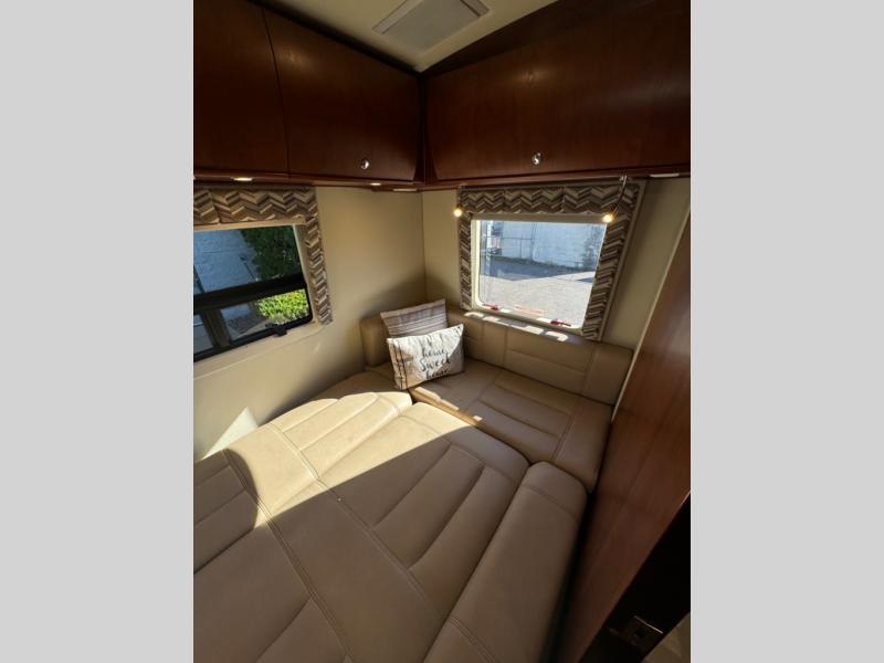 You will enjoy plenty of seating with a belted chair to the right of the door, the passenger and driver seats swivel to the back when parked, and there is an L-shaped bench behind the driver's seat for plenty of space to enjoy meals and conversation with a pedestal table between.