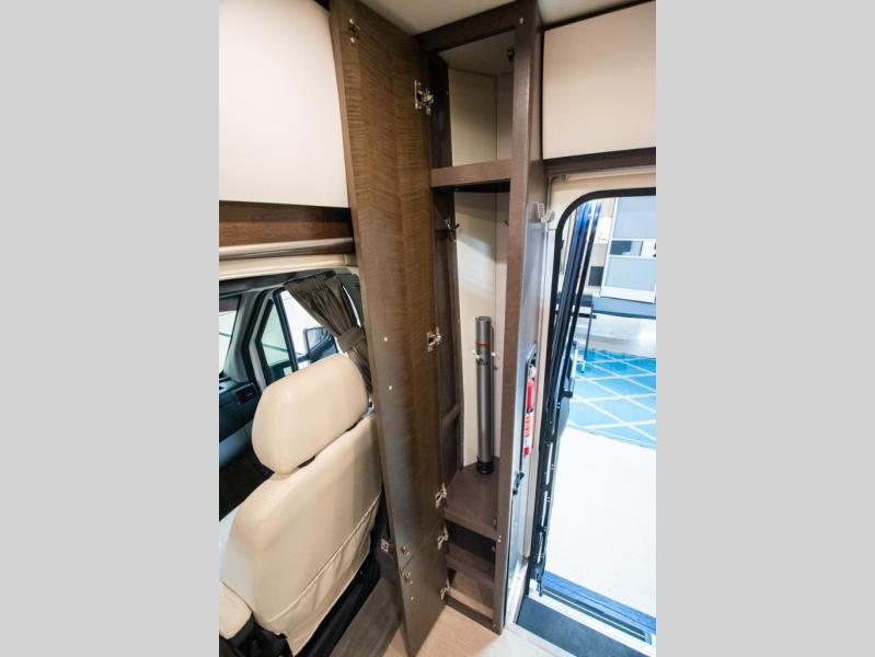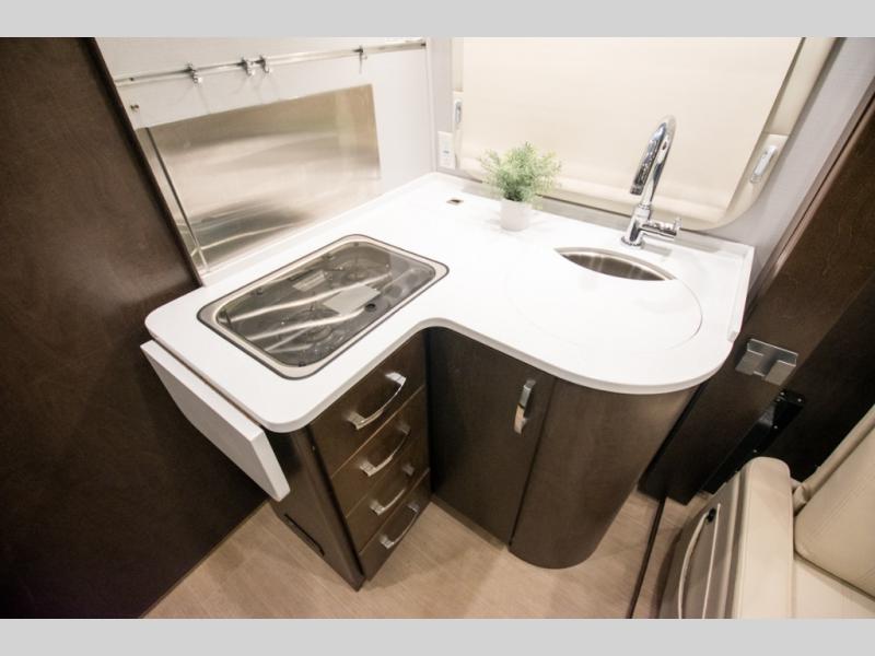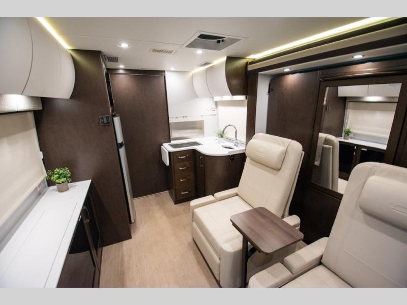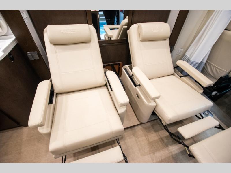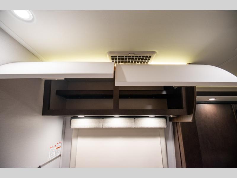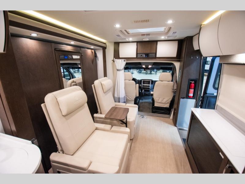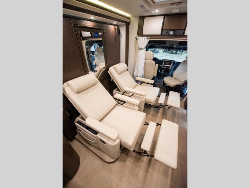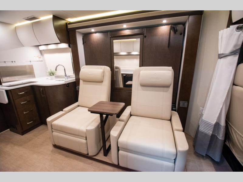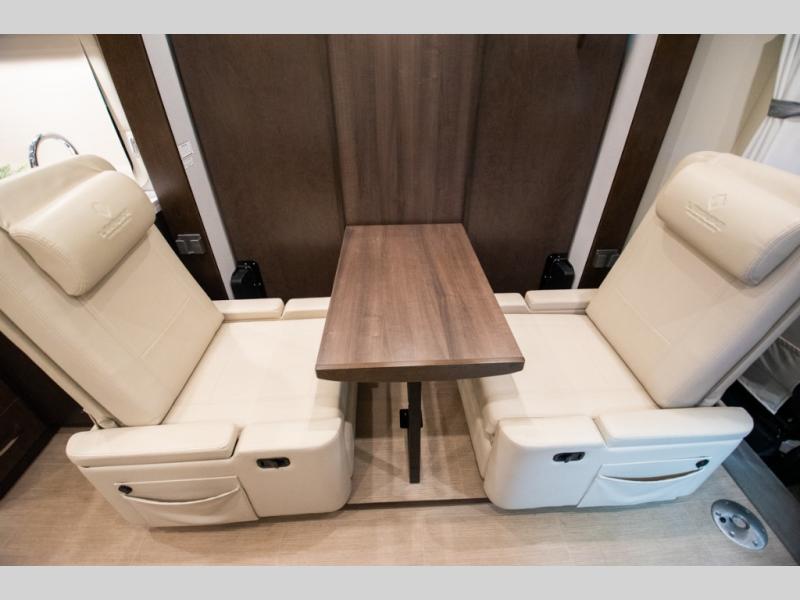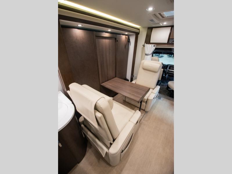Step inside and notice two lounge chairs straight ahead with a table between the two. The driver and passenger cab seats also swivel to create more of a conversation area. At night lower the Murphy bed down to create a comfortable space to sleep.