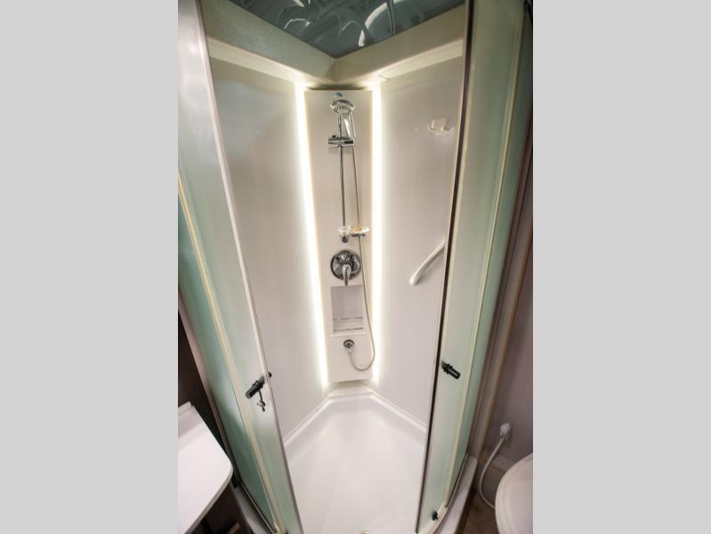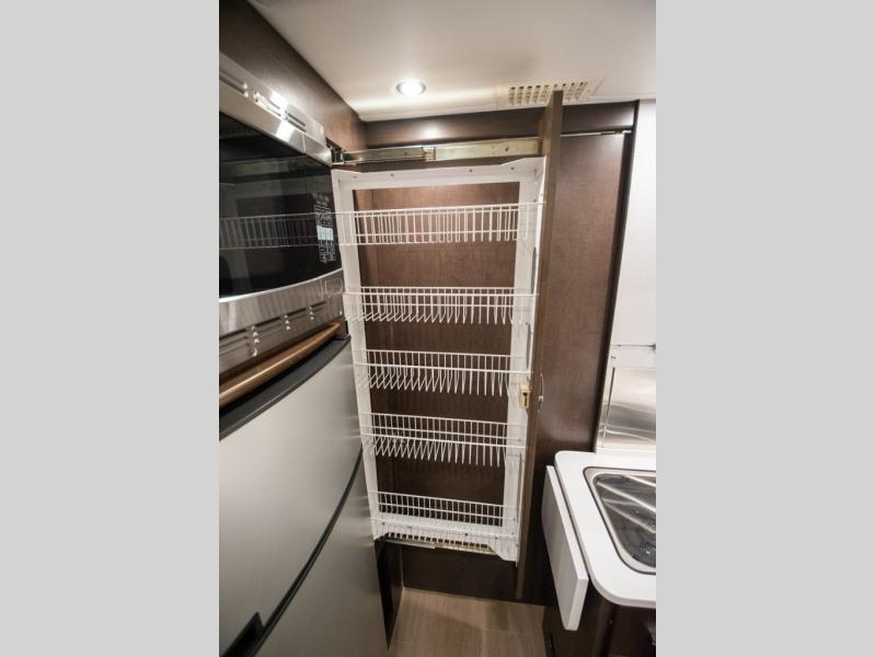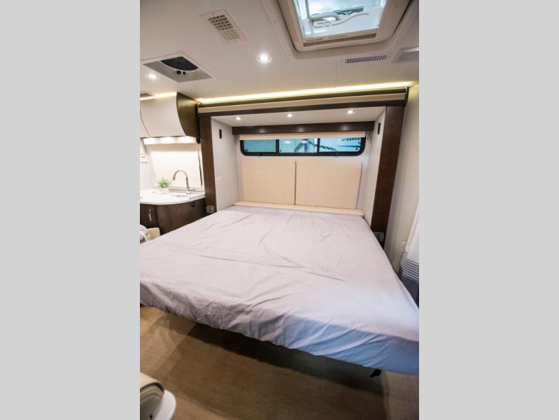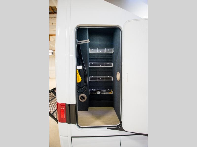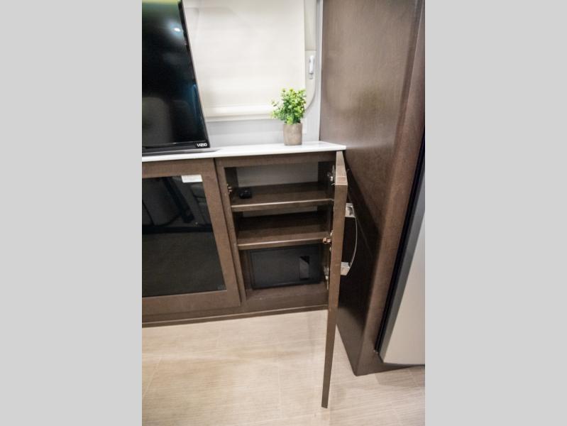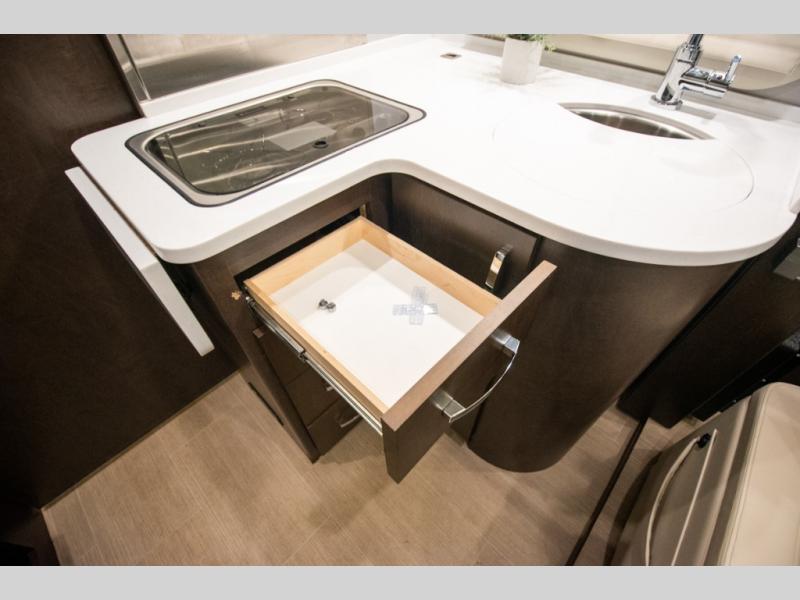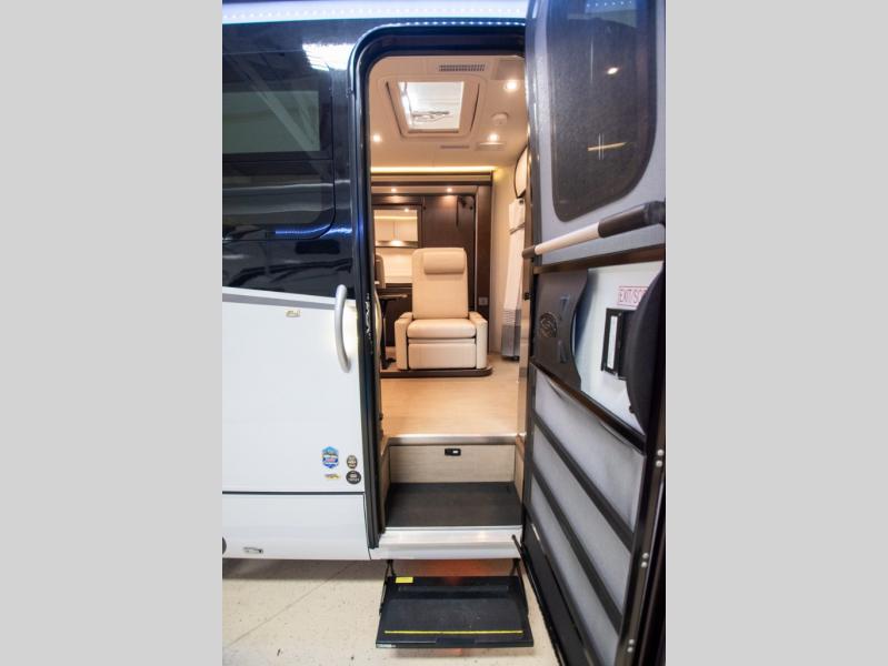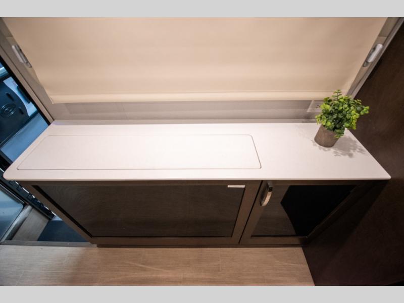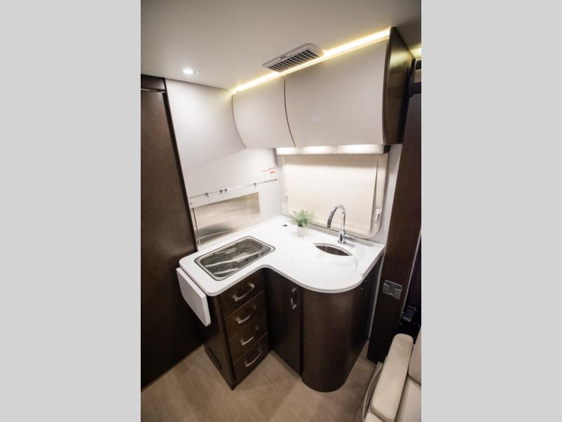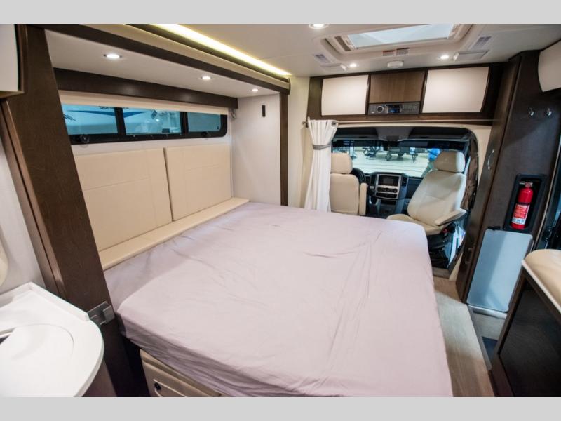 Step inside and notice two lounge chairs straight ahead with a table between the two. The driver and passenger cab seats also swivel to create more of a conversation area. At night lower the Murphy bed down to create a comfortable space to sleep.