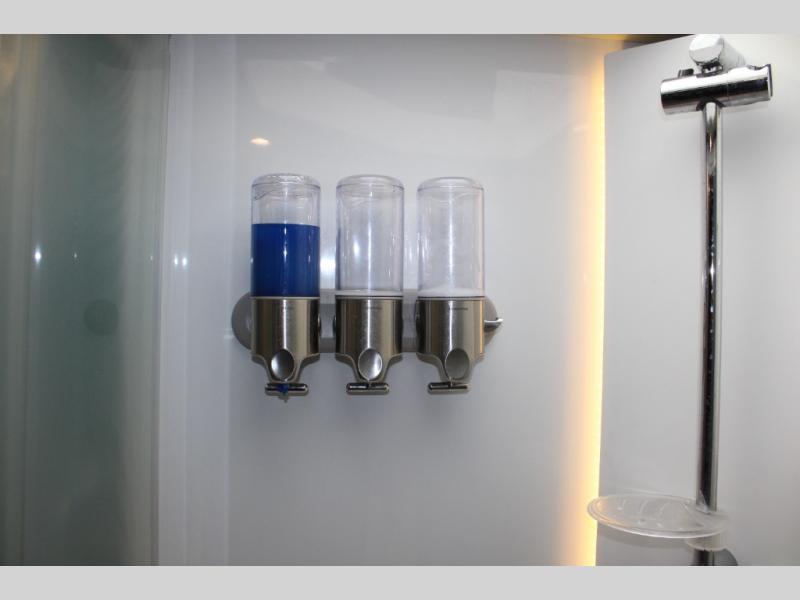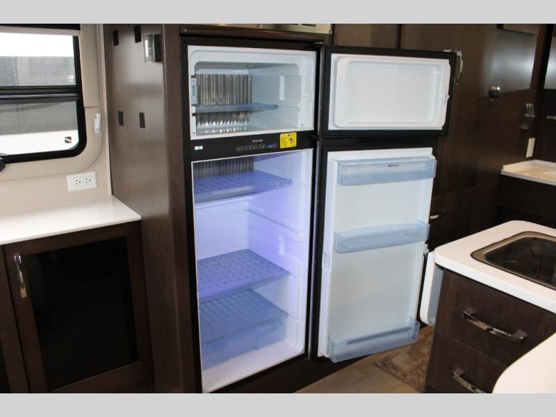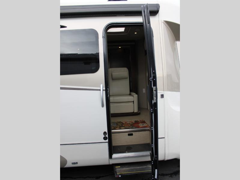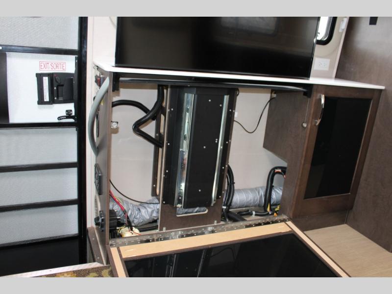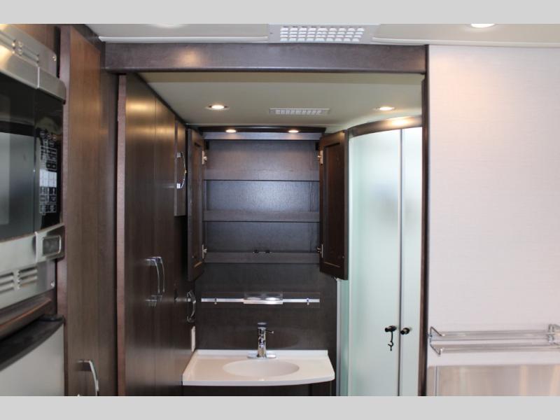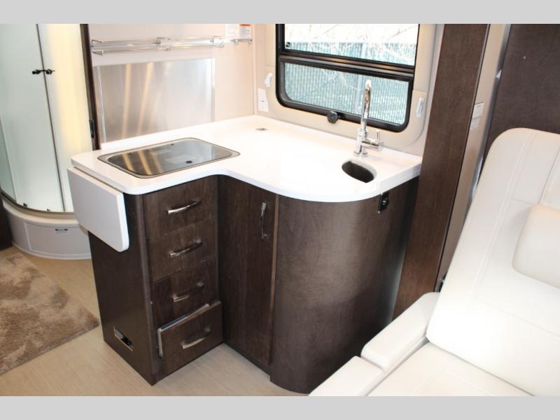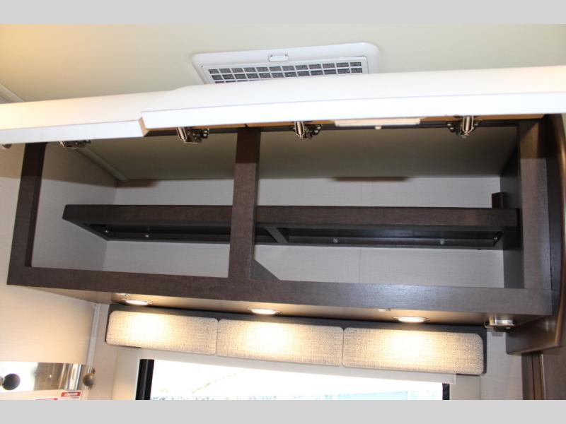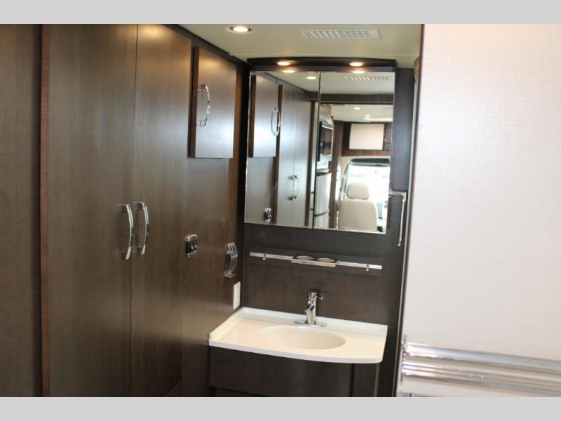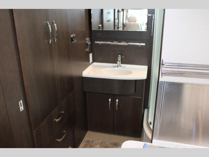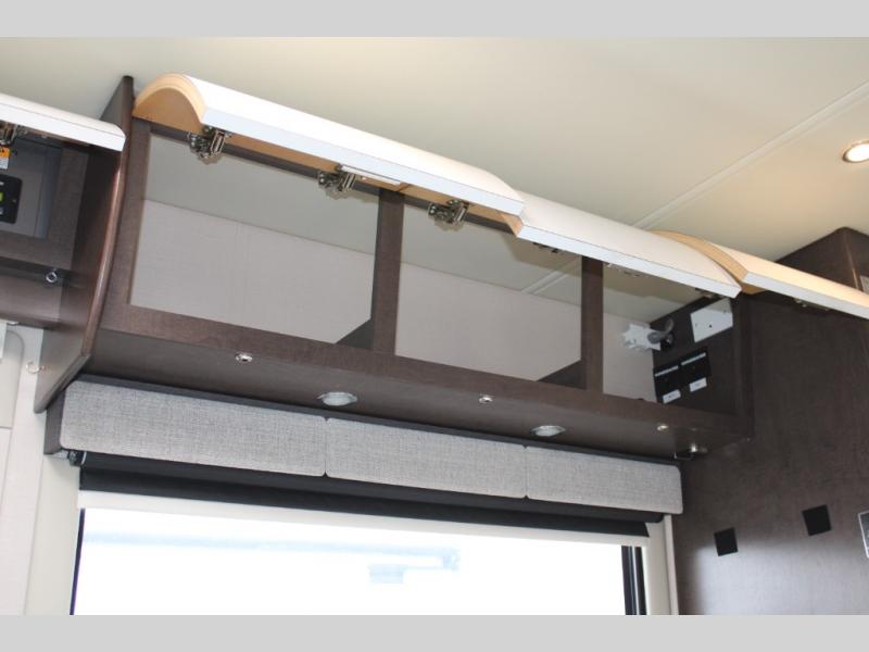 Step inside and notice two lounge chairs straight ahead with a table between the two. The driver and passenger cab seats also swivel to create more of a conversation area. At night lower the Murphy bed down to create a comfortable space to sleep.