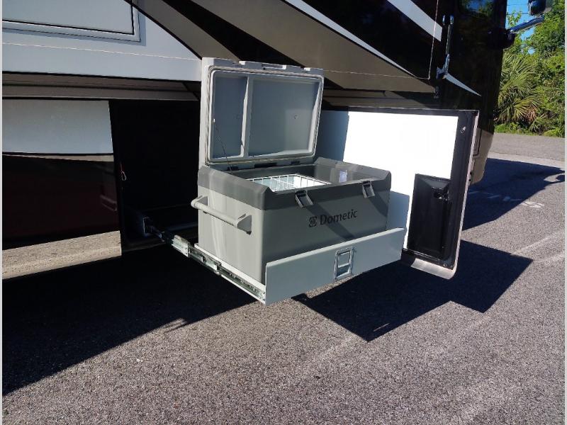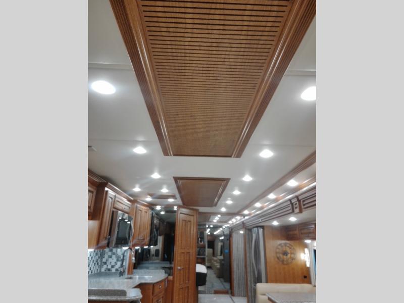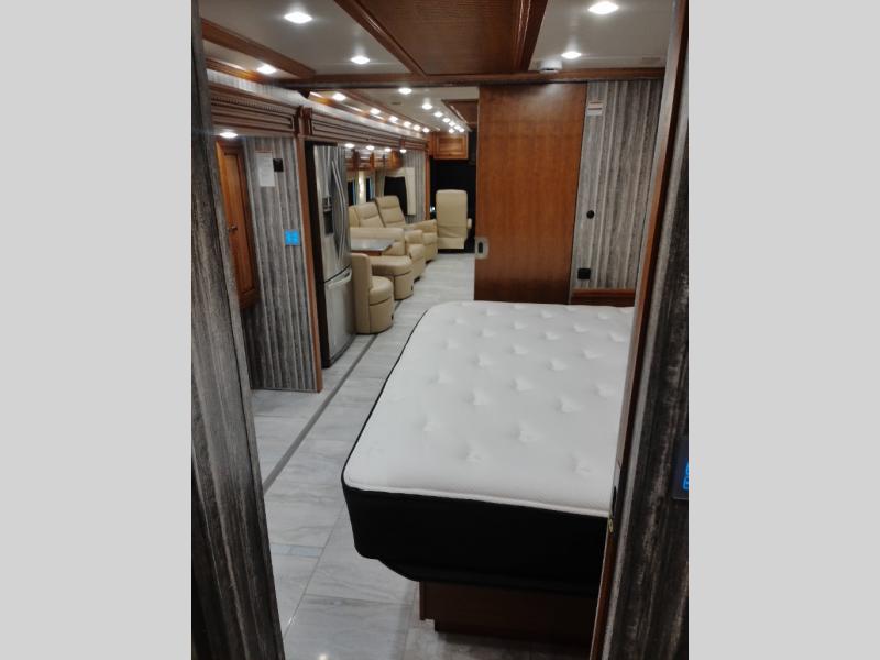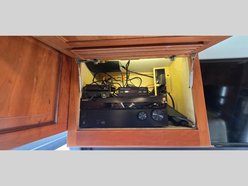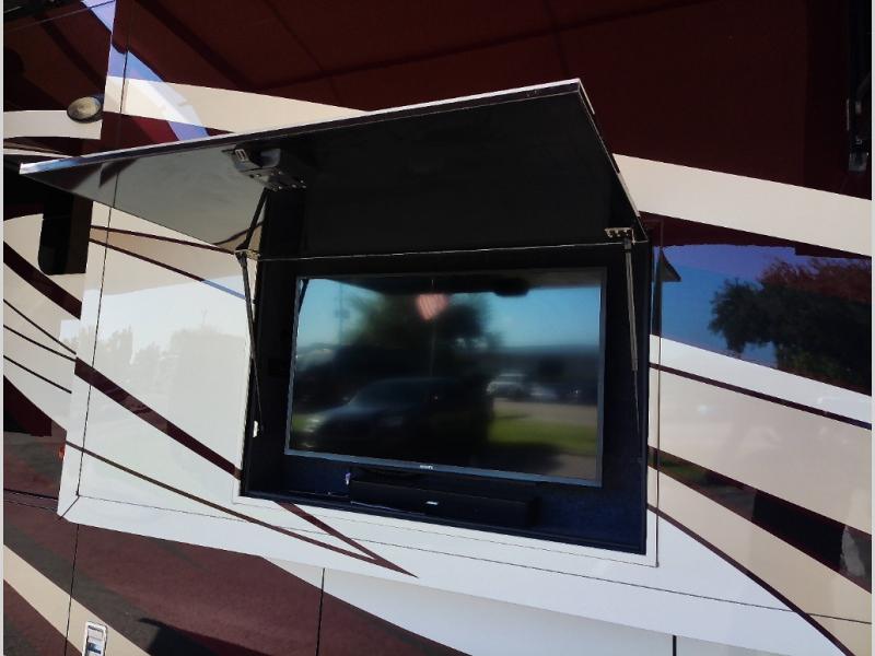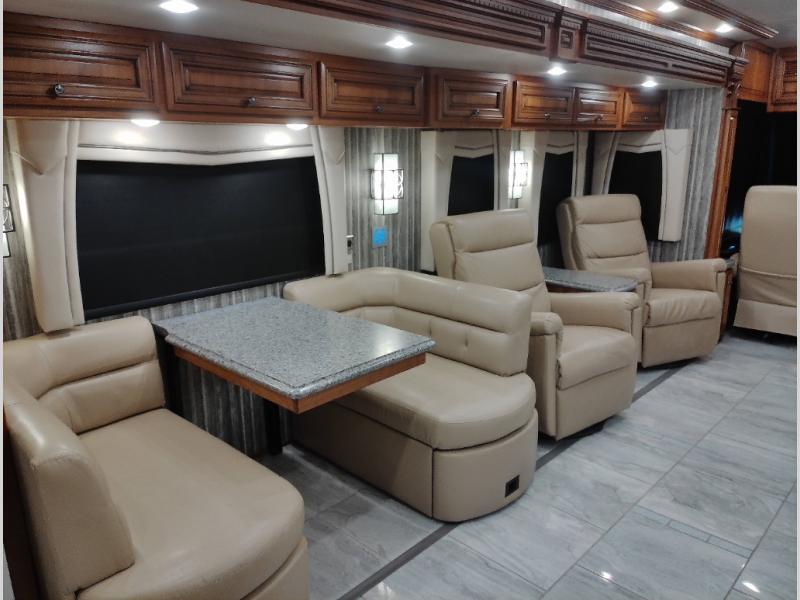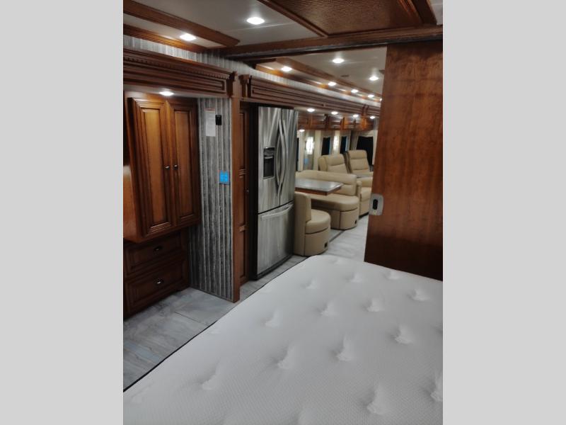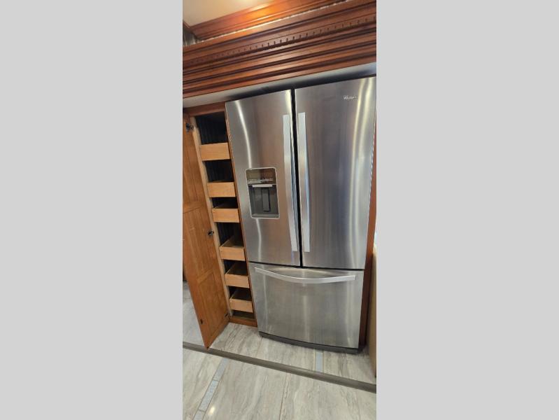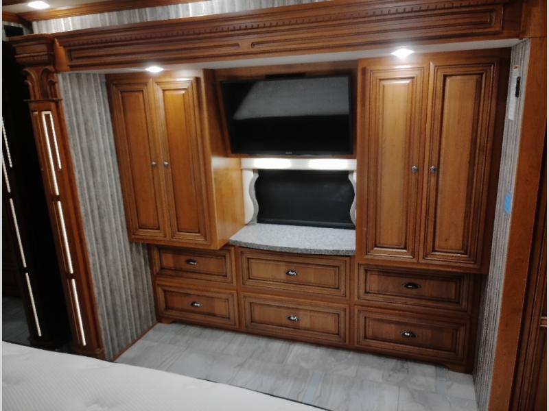 Along the road side of the motor home the wall slide out has a fireplace, LED TV on a power-lift, recliner, hide-a-leaf dinette with two chairs, and two folding chairs, refrigerator for your perishables, large pantry for your dry goods, and in the bedroom the slide continues with two wardrobes, an overhead TV, and a chest of drawers.