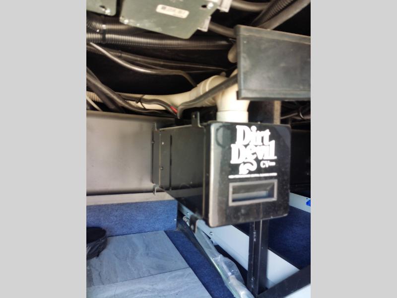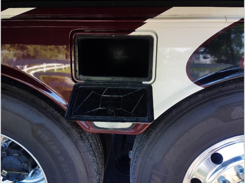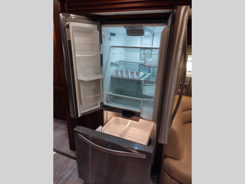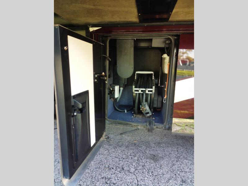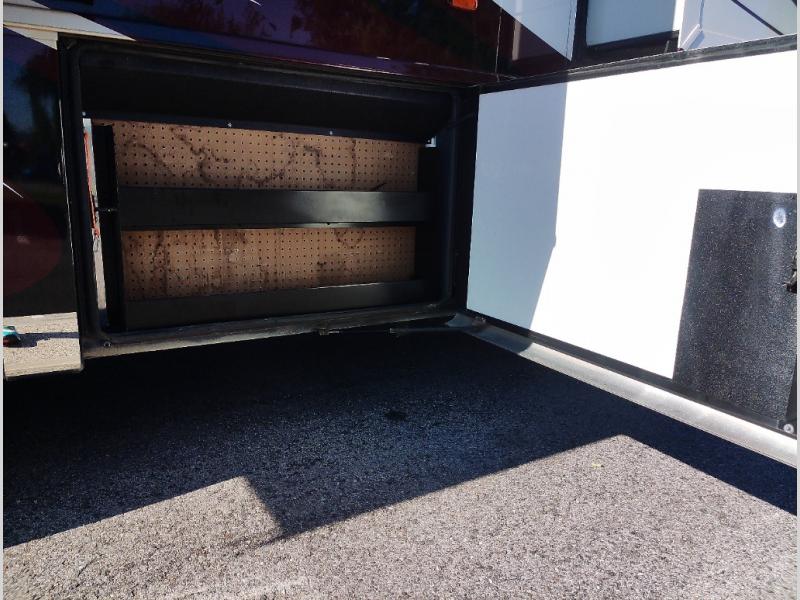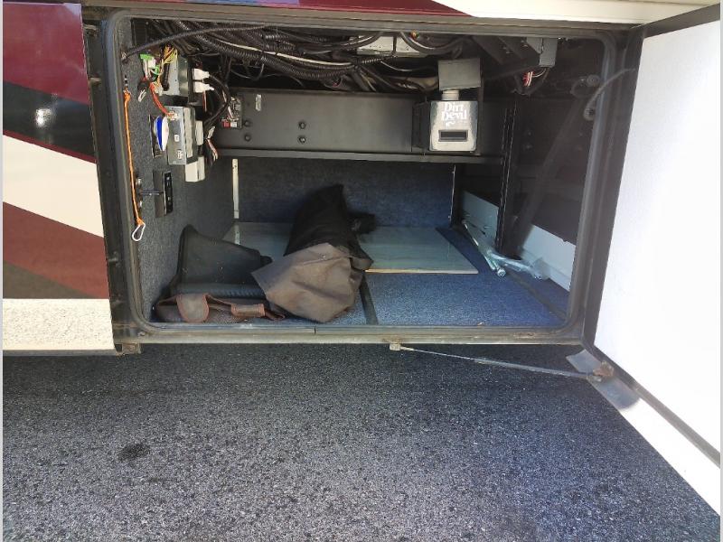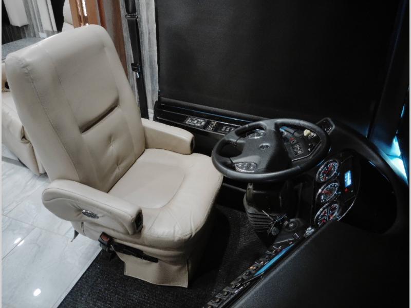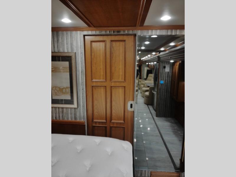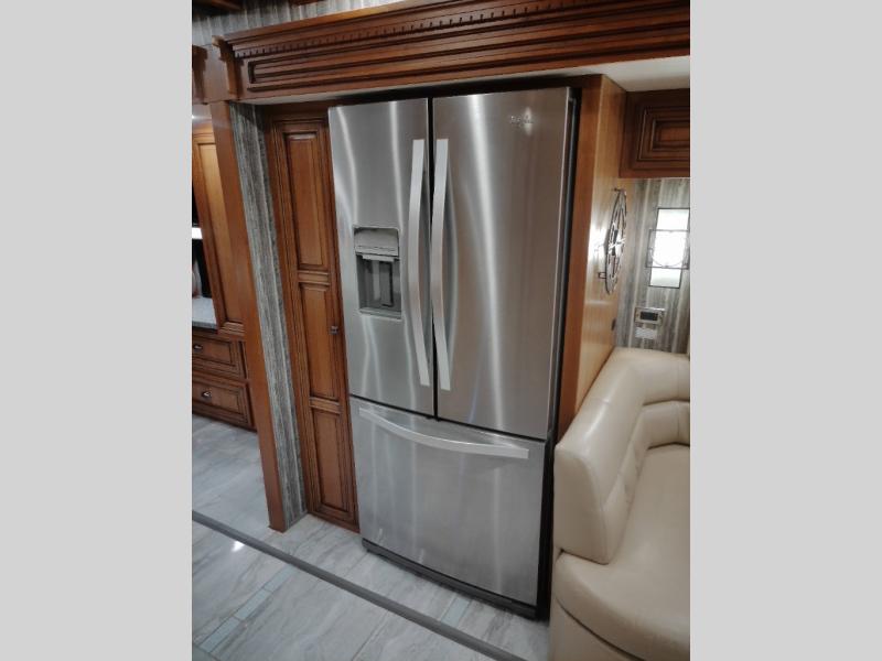 Along the road side of the motor home the wall slide out has a fireplace, LED TV on a power-lift, recliner, hide-a-leaf dinette with two chairs, and two folding chairs, refrigerator for your perishables, large pantry for your dry goods, and in the bedroom the slide continues with two wardrobes, an overhead TV, and a chest of drawers.