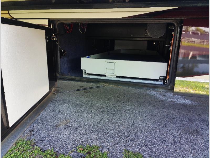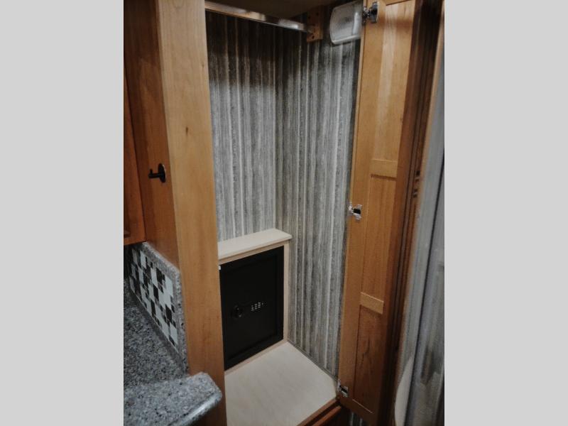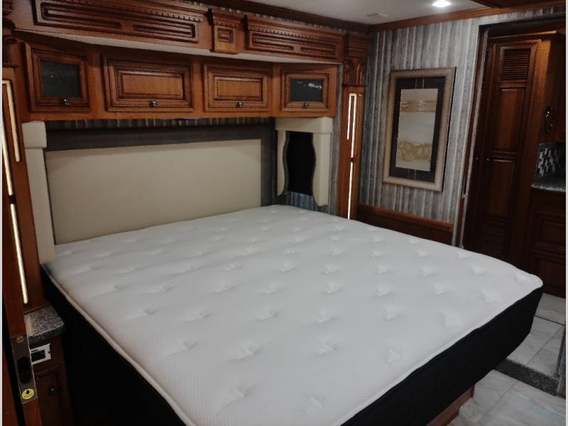 Also in the bedroom you will find nightstands on either side of a king bed and an overhead cabinet. The bed is on a slide out which opens up the floor space in the bedroom.