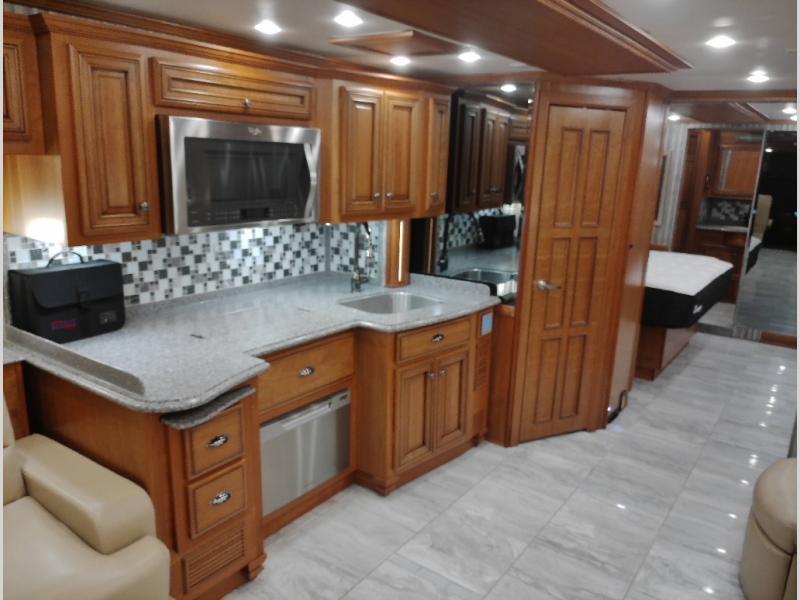 Stepping inside this motor home along the door side there is a slide out with a L-shaped 74" power retractable sofa, and food prep is so much easier with the extra counter space, you will also find a pull-out cabinet, three burner range, and large kitchen sink. Overhead cabinets can be found along this slide out where you can store dishes, games, or blankets.