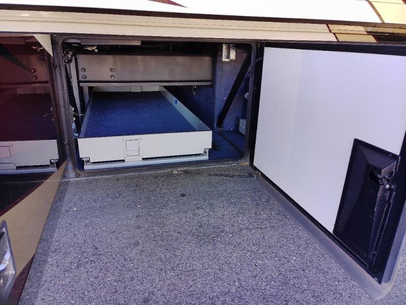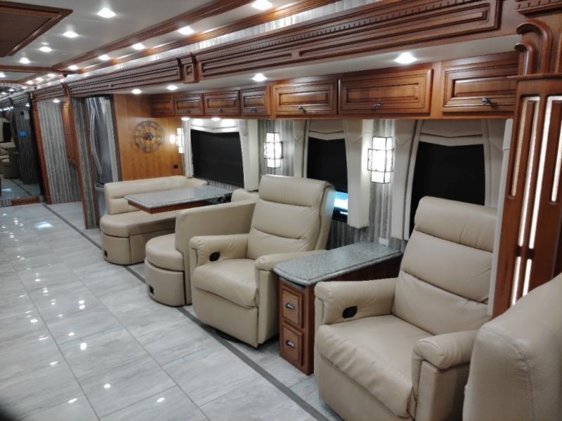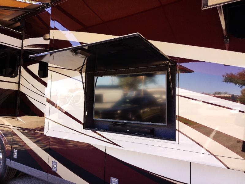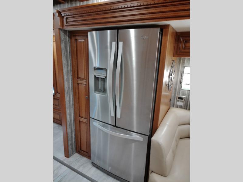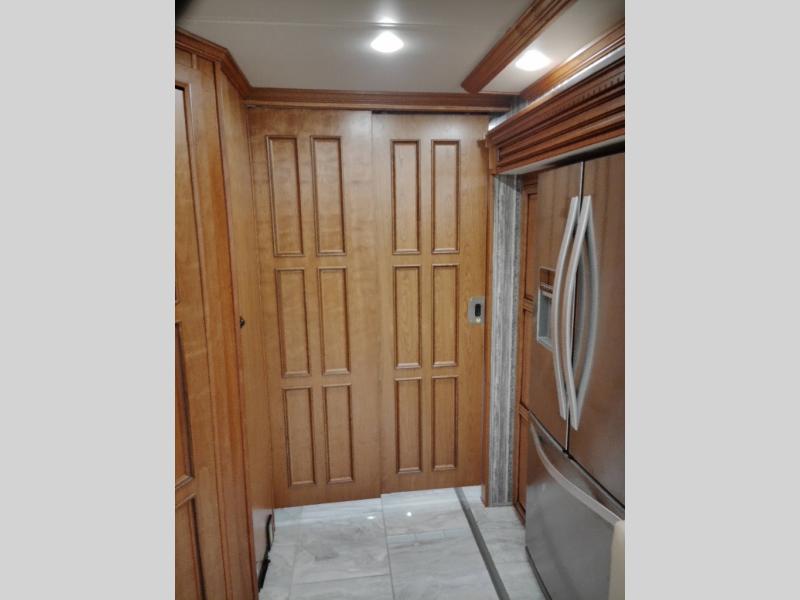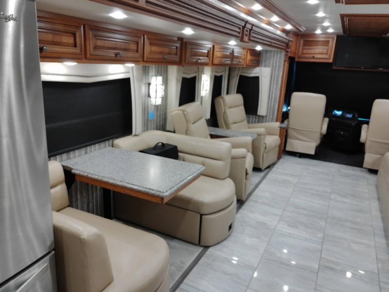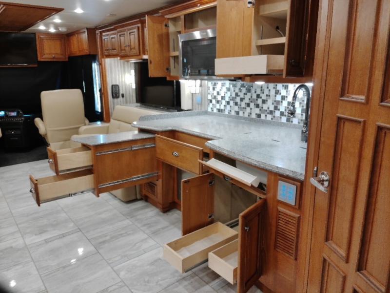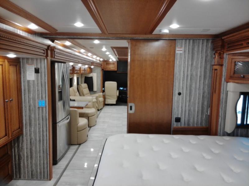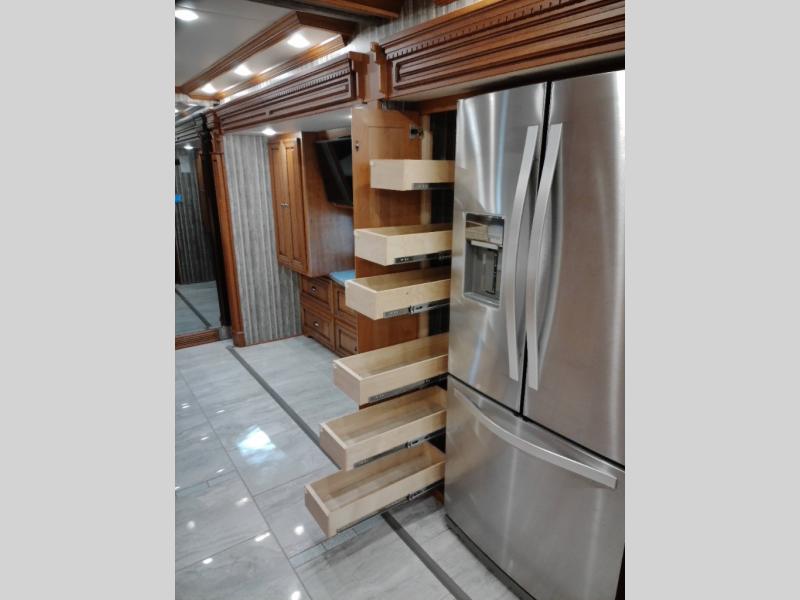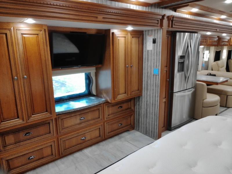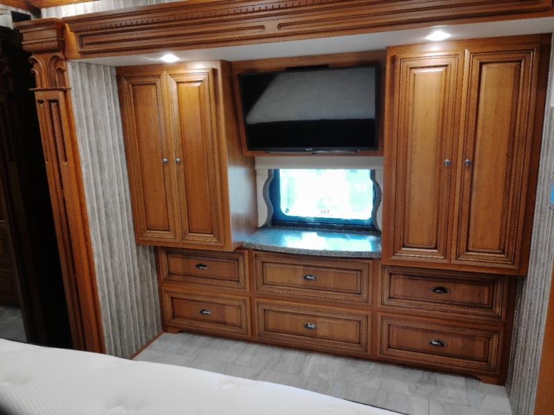 Along the road side of the motor home the wall slide out has a fireplace, LED TV on a power-lift, recliner, hide-a-leaf dinette with two chairs, and two folding chairs, refrigerator for your perishables, large pantry for your dry goods, and in the bedroom the slide continues with two wardrobes, an overhead TV, and a chest of drawers.