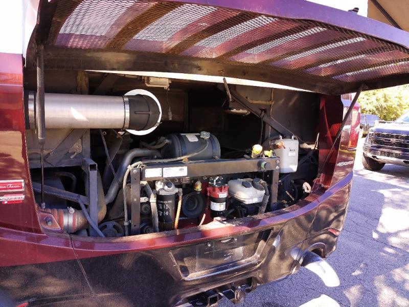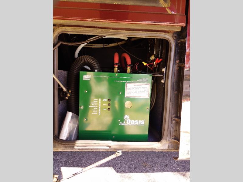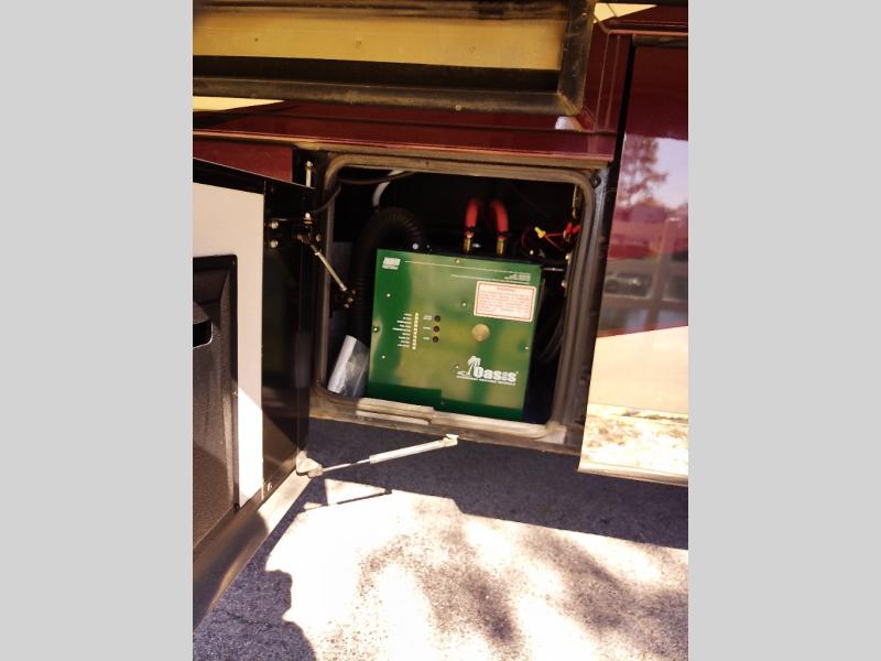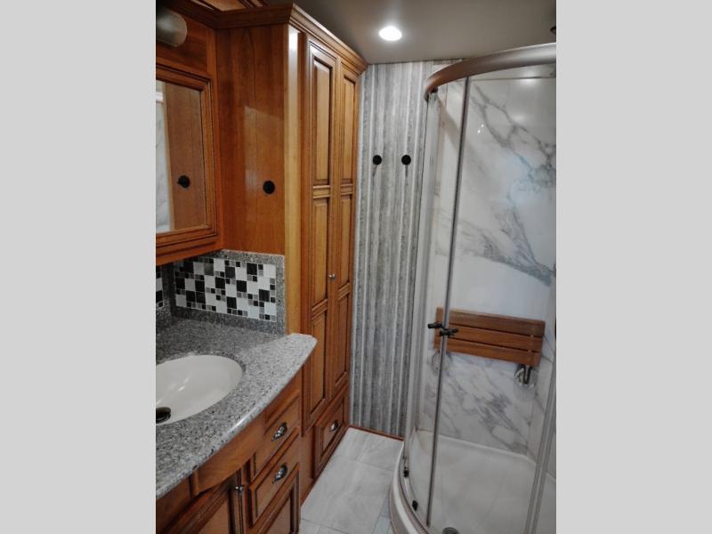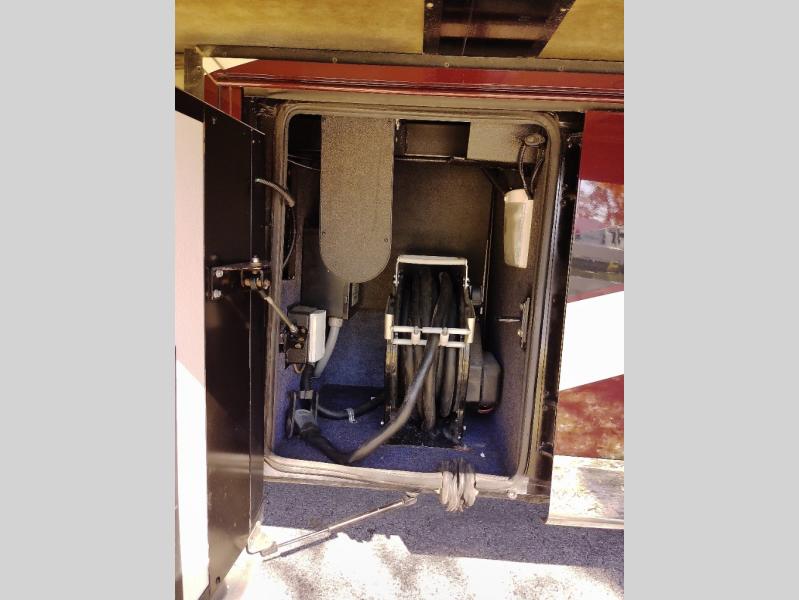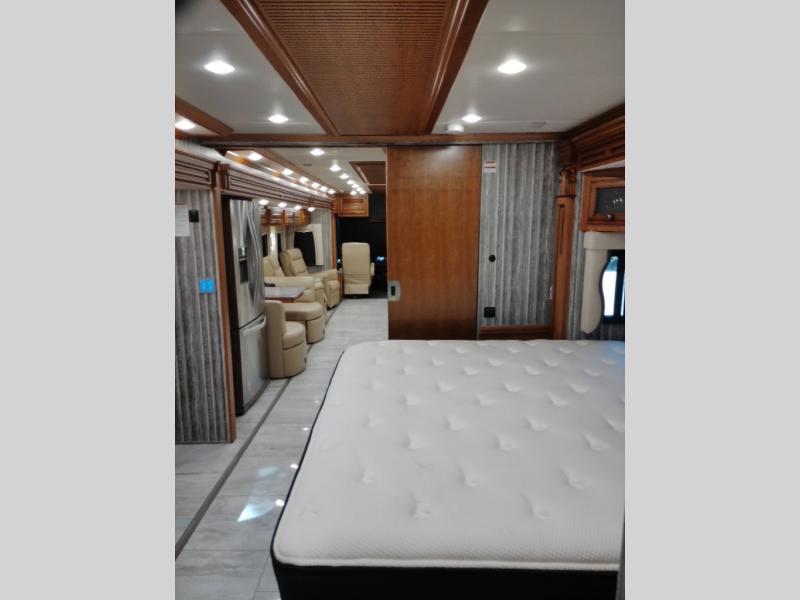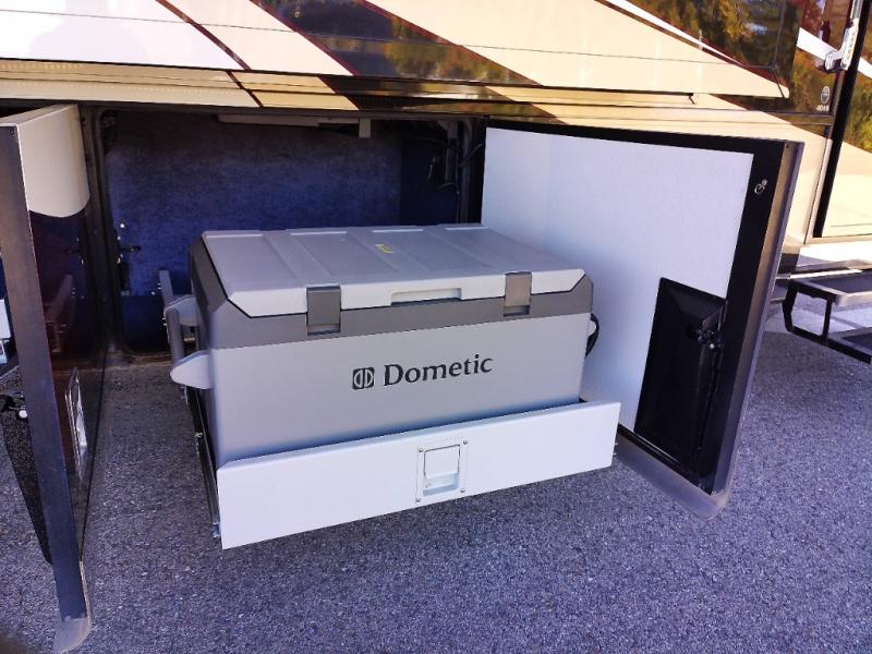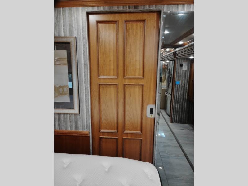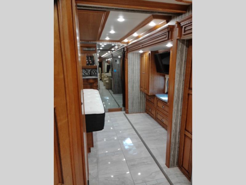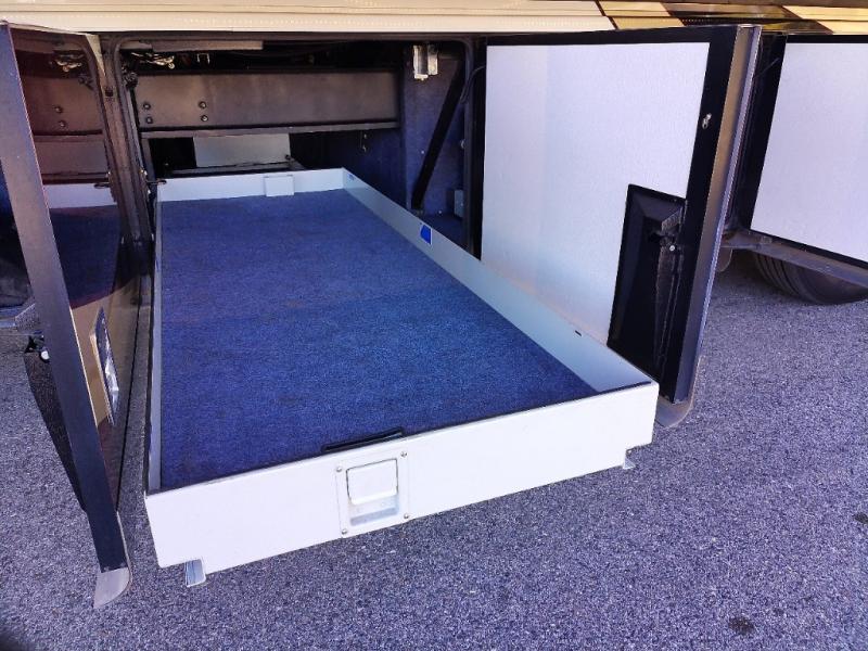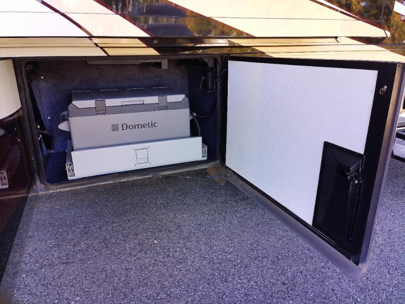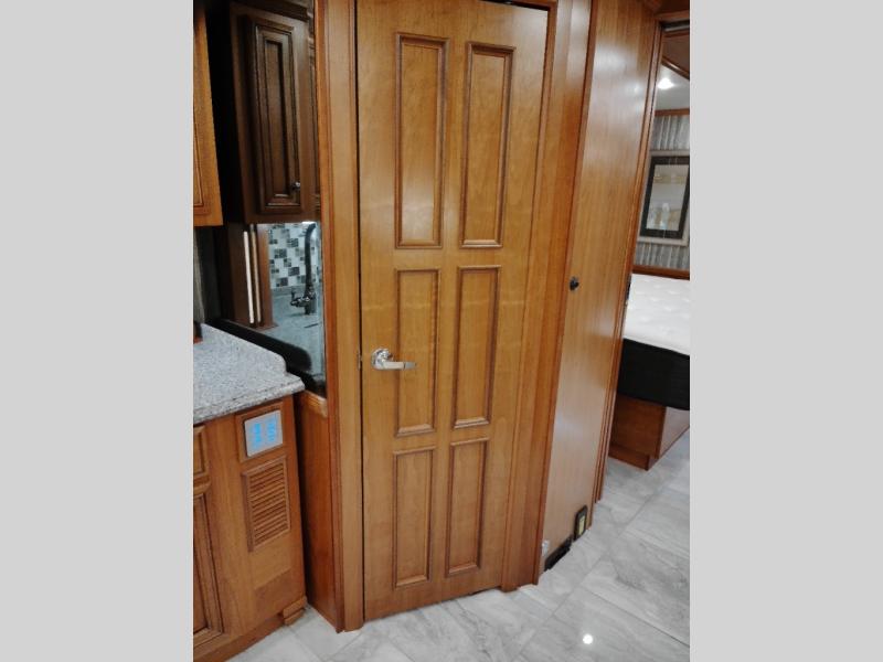Along the road side of the motor home the wall slide out has a fireplace, LED TV on a power-lift, recliner, hide-a-leaf dinette with two chairs, and two folding chairs, refrigerator for your perishables, large pantry for your dry goods, and in the bedroom the slide continues with two wardrobes, an overhead TV, and a chest of drawers.