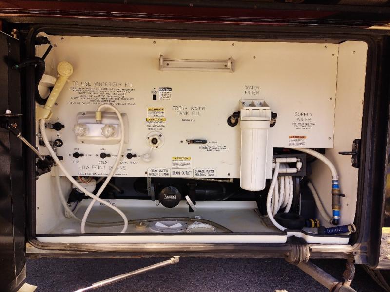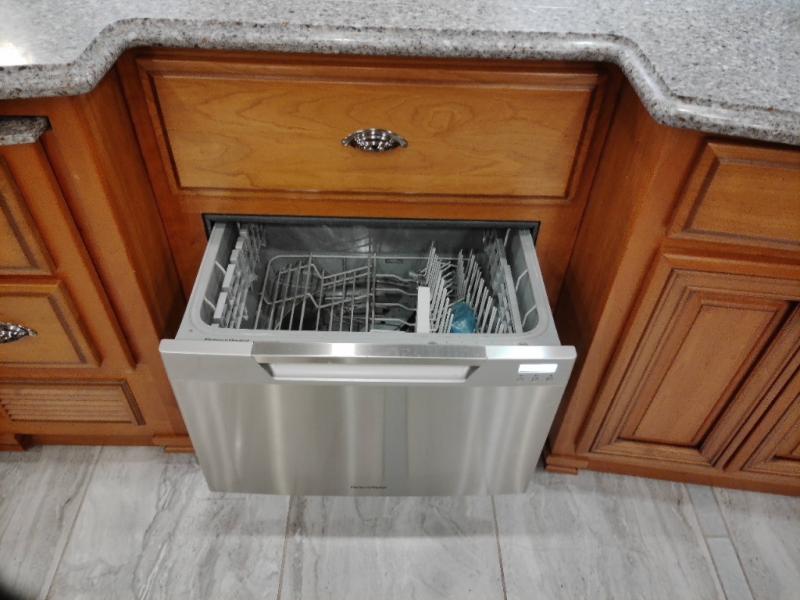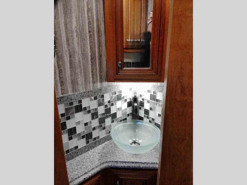 Stepping inside this motor home along the door side there is a slide out with a L-shaped 74" power retractable sofa, and food prep is so much easier with the extra counter space, you will also find a pull-out cabinet, three burner range, and large kitchen sink. Overhead cabinets can be found along this slide out where you can store dishes, games, or blankets.