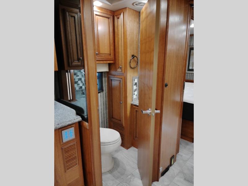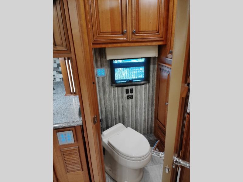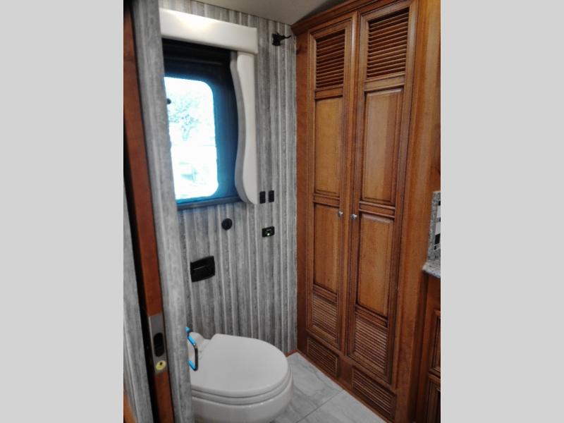 Just past this slide there is a half bath with a toilet, sink, linen cabinet and overhead storage.