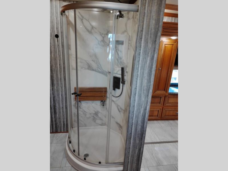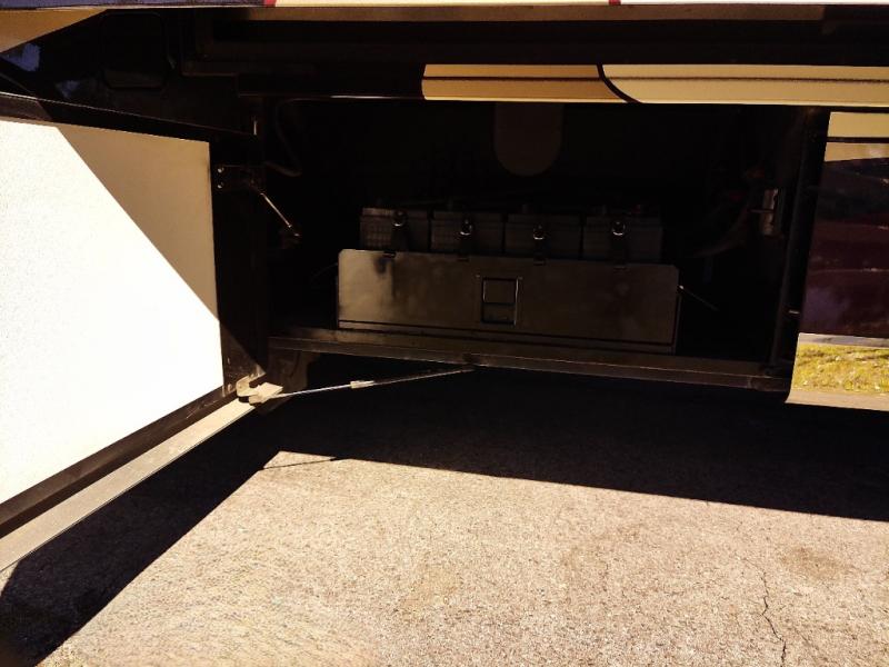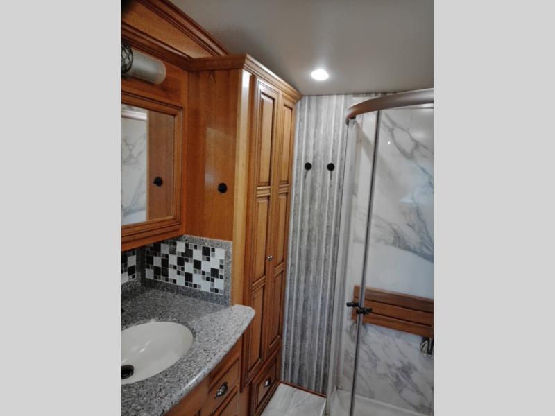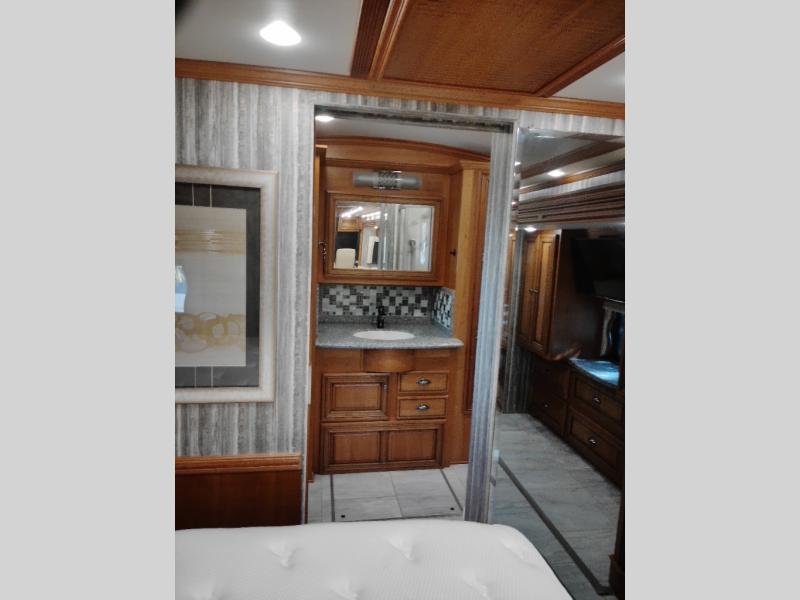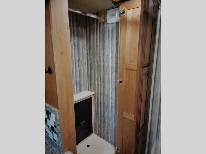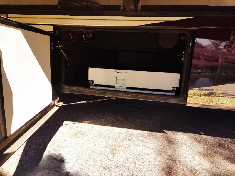 Also in the bedroom you will find nightstands on either side of a king bed and an overhead cabinet. The bed is on a slide out which opens up the floor space in the bedroom.
